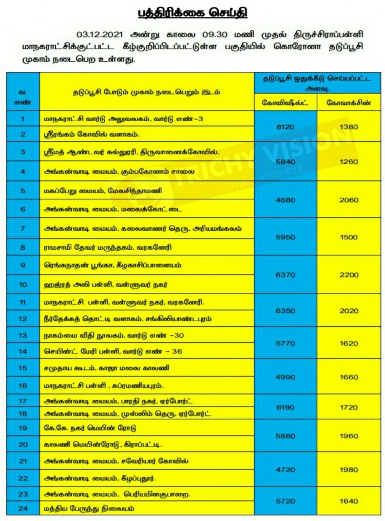 திருச்சி மாநகரில் நாளை (03.12.2021) கோவிசீல்டு, கோவாக்சின் தடுப்பு ஊசிகள் போடப்படும் இடங்களை மாநகராட்சி நிர்வாகம் அறிவித்துள்ளது.