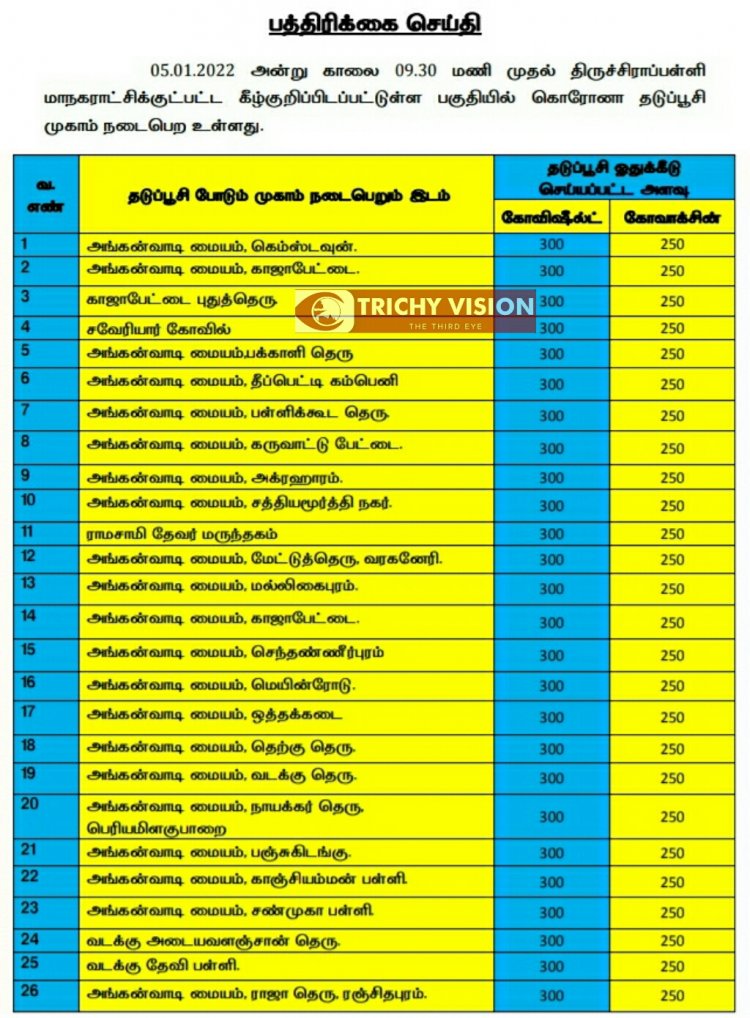 திருச்சி மாநகரில் நாளை (05.01.2022) கோவிசீல்டு, கோவாக்சின் தடுப்பு ஊசிகள் போடப்படும் இடங்களை மாநகராட்சி நிர்வாகம் அறிவித்துள்ளது.