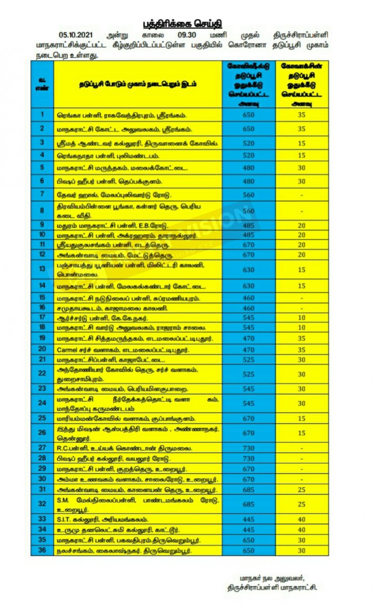 திருச்சி மாநகரில் நாளை (05.10.2021) கோவிசீல்டு, கோவாக்சின் தடுப்பு ஊசிகள் போடப்படும் இடங்களை மாநகராட்சி நிர்வாகம் அறிவித்துள்ளது.
