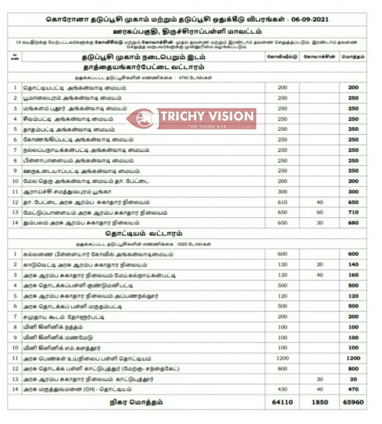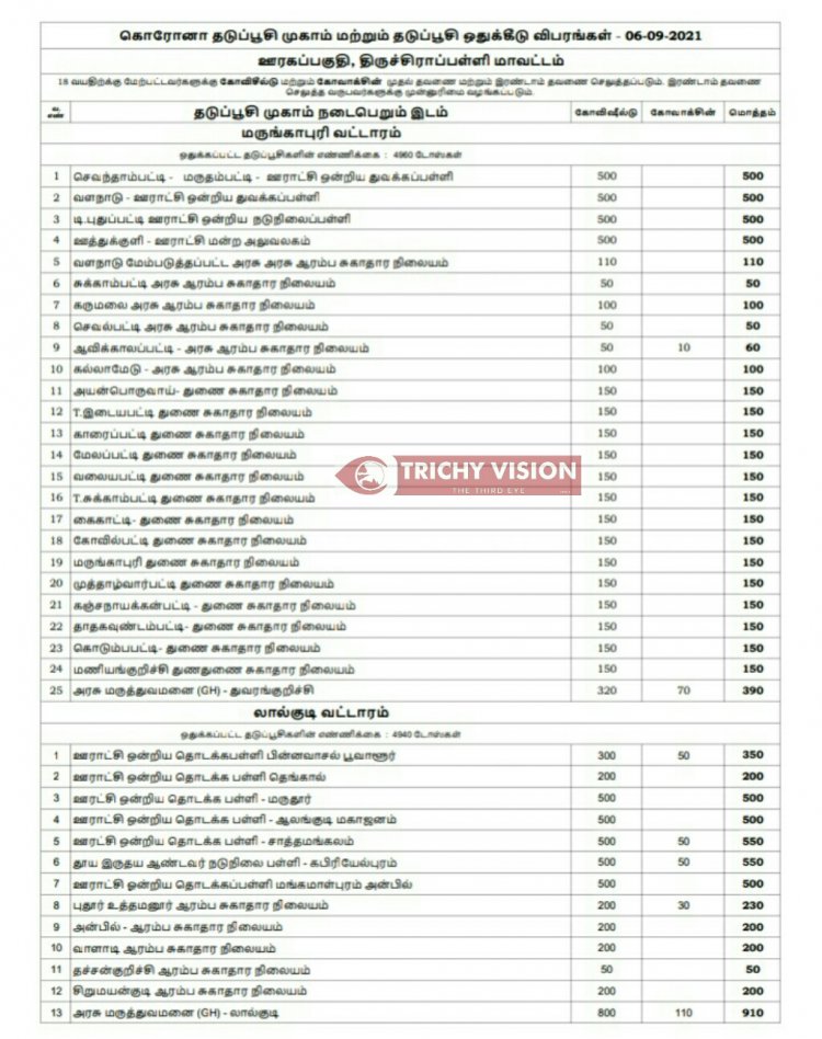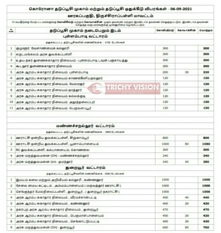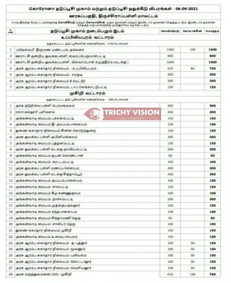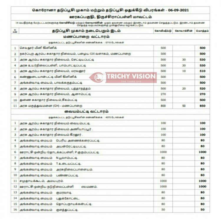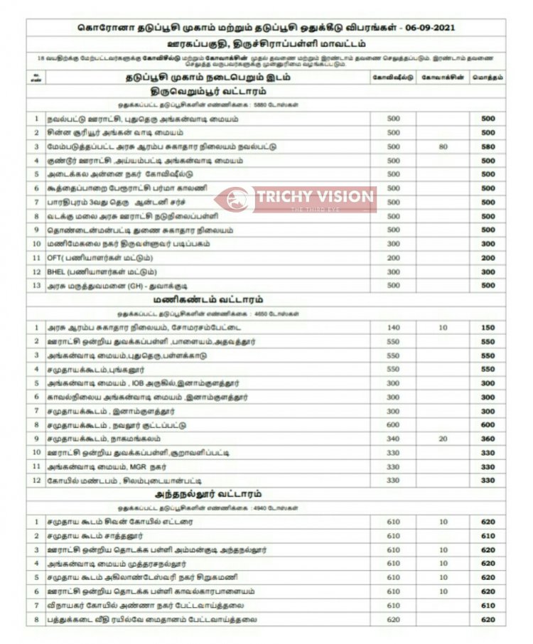 திருச்சி மாவட்டத்தில் நாளை (06.09.2021) கோவிசீல்டு, கோவாக்சின் தடுப்பு ஊசிகள் போடப்படும் இடங்களை மாவட்ட நிர்வாகம் அறிவித்துள்ளது.