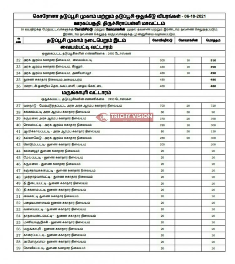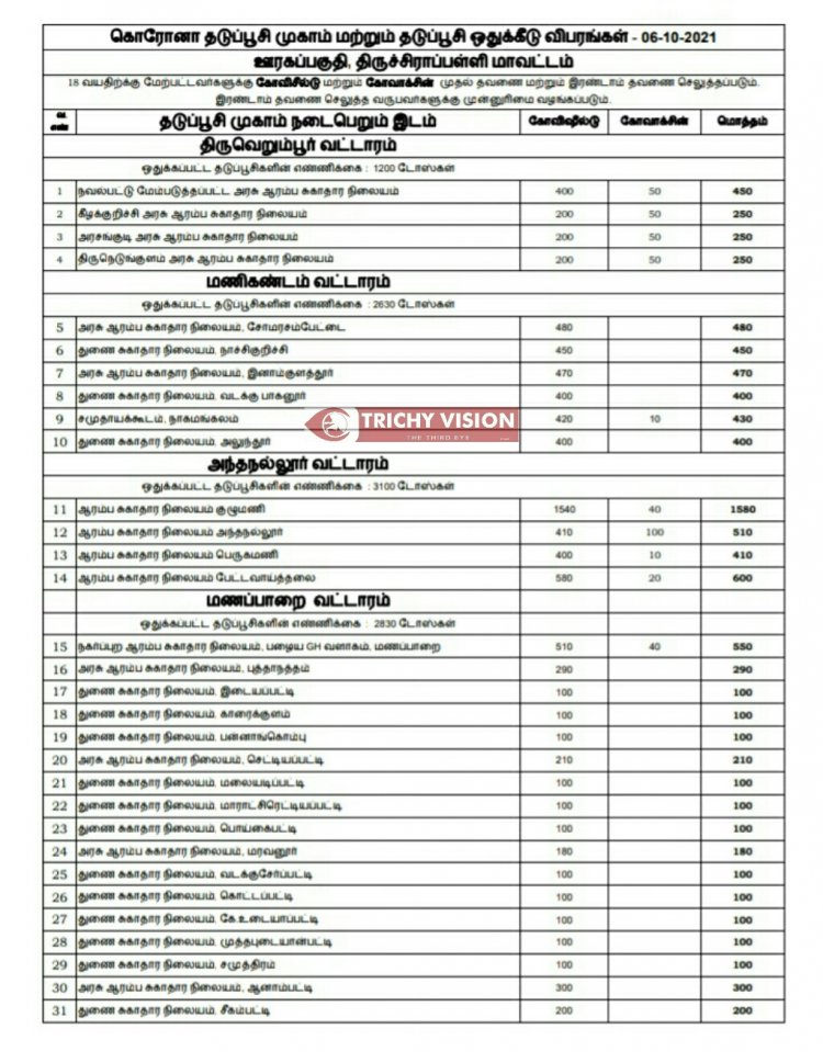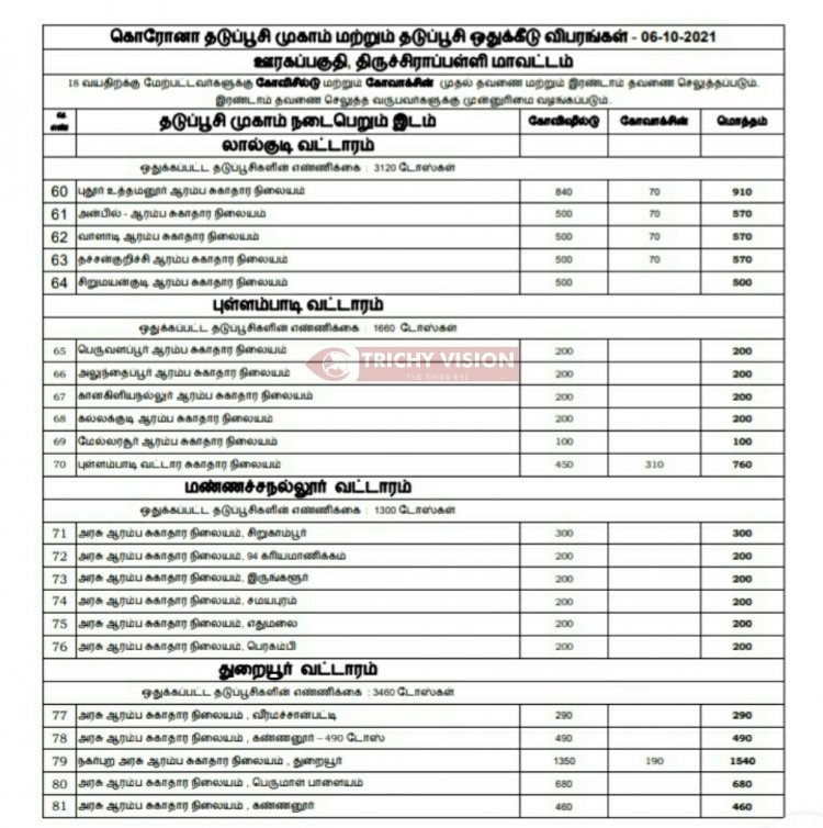 திருச்சி மாவட்டத்தில் நாளை (06.10.2021) கோவிசீல்டு, கோவாக்சின் தடுப்பு ஊசிகள் போடப்படும் இடங்களை மாவட்ட நிர்வாகம் அறிவித்துள்ளது.