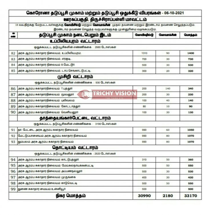 திருச்சி மாவட்டத்தில் நாளை (06.10.2021) கோவிசீல்டு 30990, கோவாக்சின் 2180 தடுப்பூசிகள் போடப்படும் என மாவட்ட ஆட்சியர் தெரிவித்துள்ளார்.