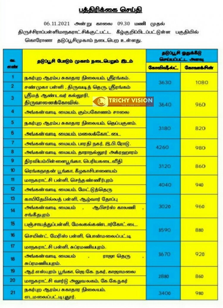 திருச்சி மாநகரில் நாளை (06.11.2021) கோவிசீல்டு, கோவாக்சின் தடுப்பு ஊசிகள் போடப்படும் இடங்களை மாநகராட்சி நிர்வாகம் அறிவித்துள்ளது.