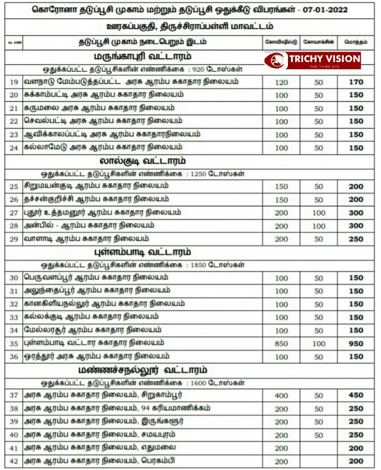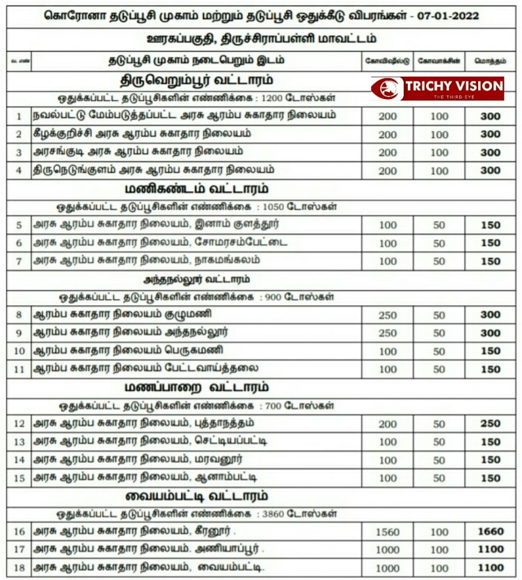 திருச்சி மாவட்டத்தில் நாளை (07.01.2022) கோவிசீல்டு, கோவாக்சின் தடுப்பு ஊசிகள் போடப்படும் இடங்களை மாவட்ட நிர்வாகம் அறிவித்துள்ளது.