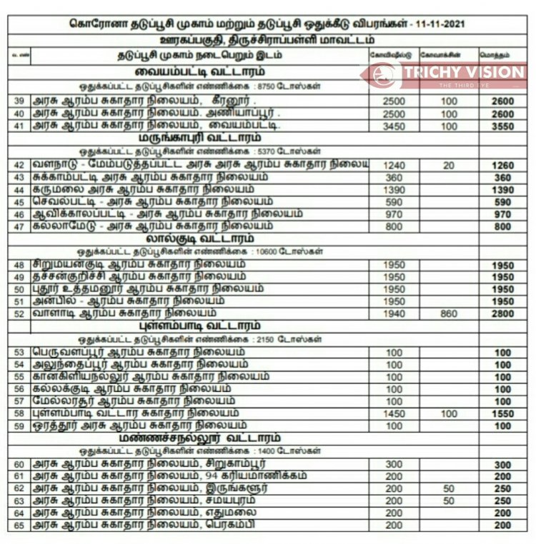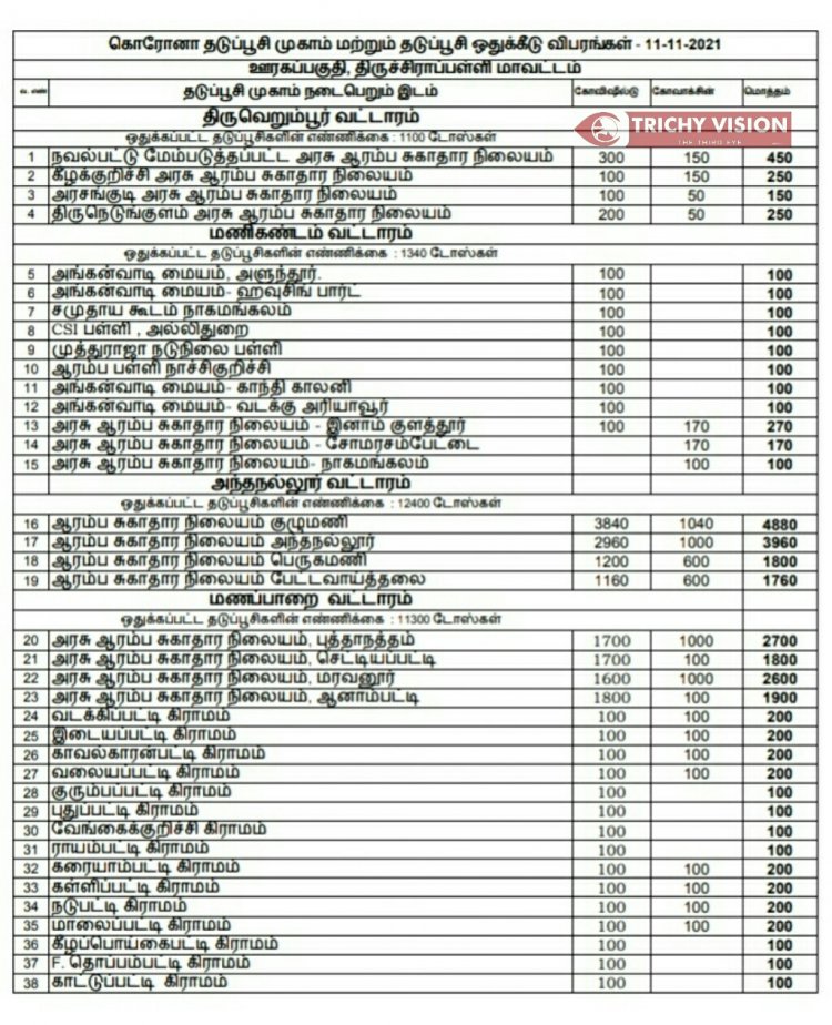 திருச்சி மாவட்டத்தில் நாளை (11.11.2021) கோவிசீல்டு, கோவாக்சின் தடுப்பு ஊசிகள் போடப்படும் இடங்களை மாவட்ட நிர்வாகம் அறிவித்துள்ளது.