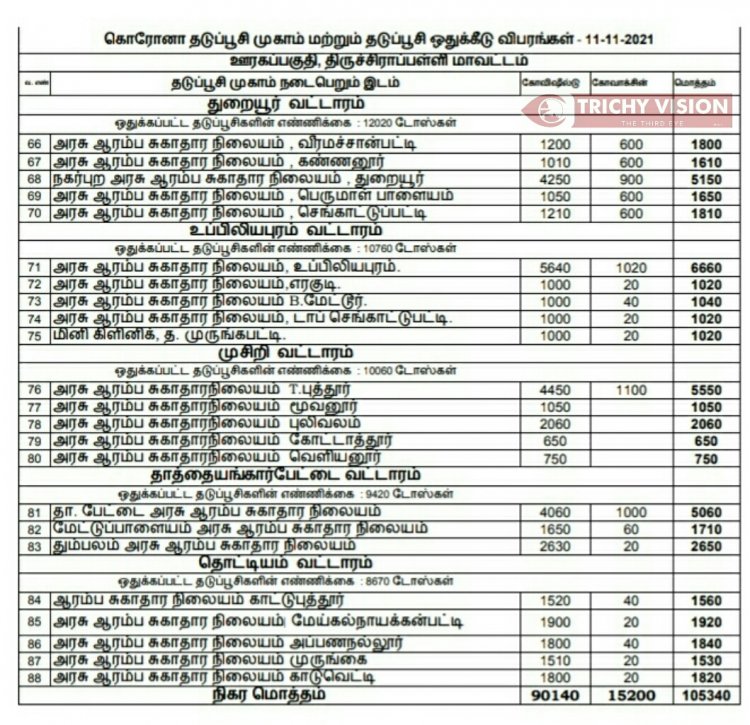 திருச்சி மாவட்டத்தில் நாளை (11.11.2021) கோவிசீல்டு, கோவாக்சின் தடுப்பு ஊசிகள் போடப்படும் இடங்களை மாவட்ட நிர்வாகம் அறிவித்துள்ளது.
