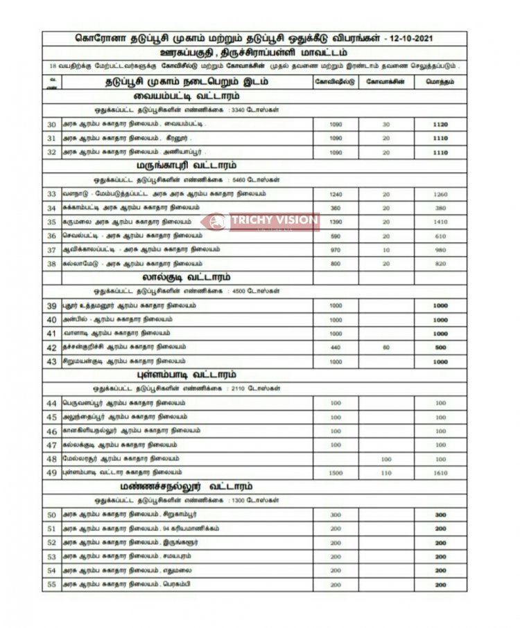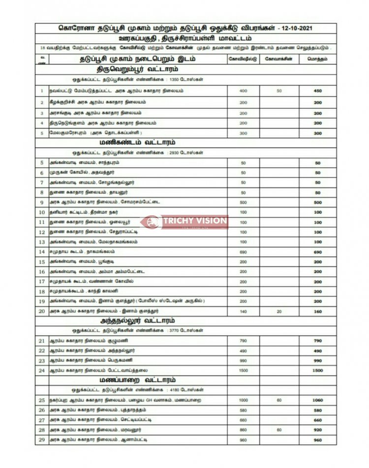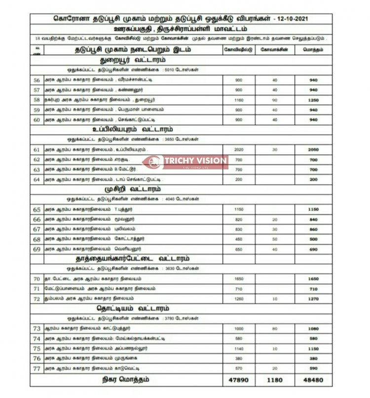 திருச்சி மாவட்டத்தில் நாளை (12.10.2021) கோவிசீல்டு, கோவாக்சின் தடுப்பு ஊசிகள் போடப்படும் இடங்களை மாவட்ட நிர்வாகம் அறிவித்துள்ளது.