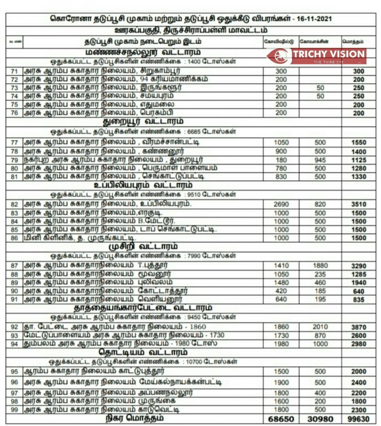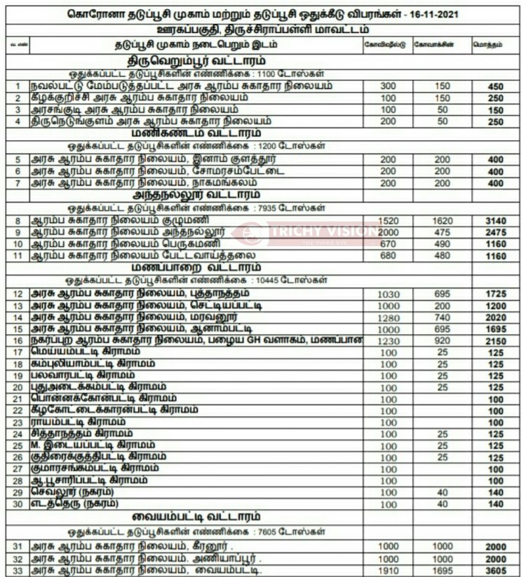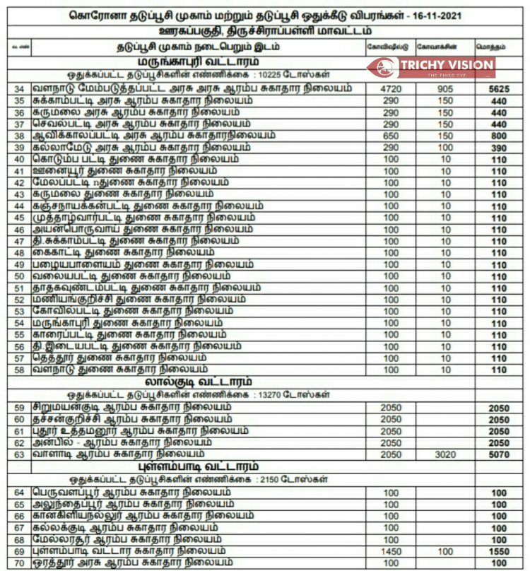 திருச்சி மாவட்டத்தில் நாளை (16.11.2021) கோவிசீல்டு, கோவாக்சின் தடுப்பு ஊசிகள் போடப்படும் இடங்களை மாவட்ட நிர்வாகம் அறிவித்துள்ளது.