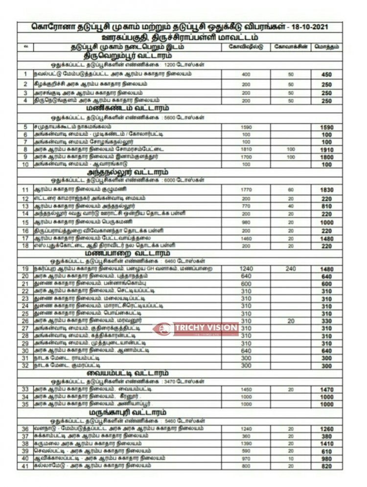 திருச்சி மாவட்டத்தில் நாளை (18.10.2021) கோவிசீல்டு, கோவாக்சின் தடுப்பு ஊசிகள் போடப்படும் இடங்களை மாவட்ட நிர்வாகம் அறிவித்துள்ளது.
