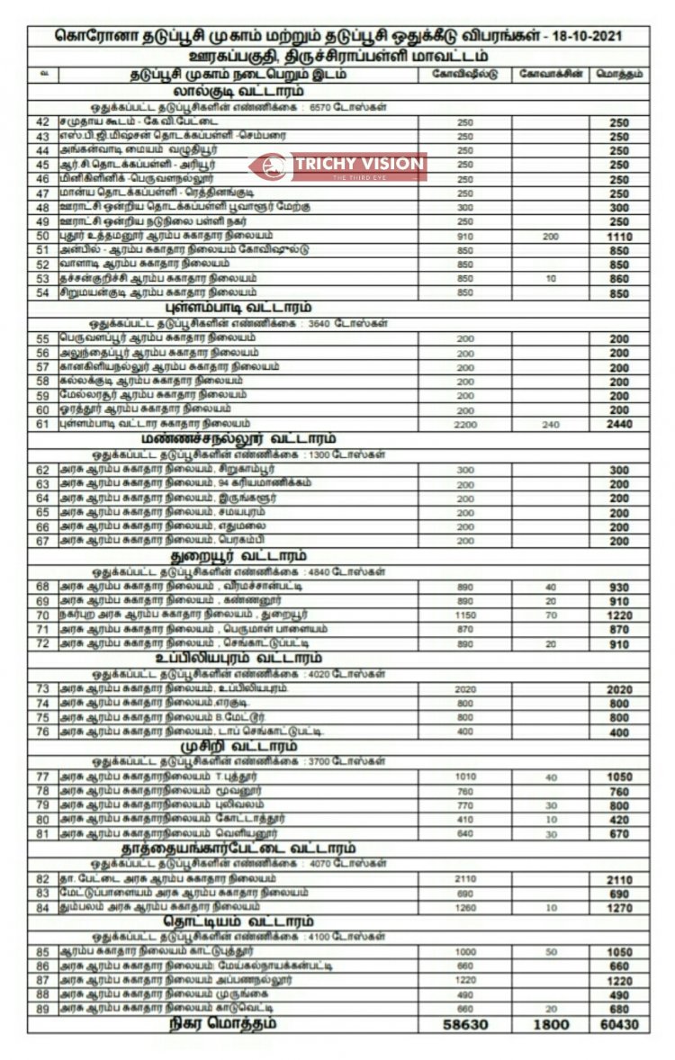 திருச்சி மாவட்டத்தில் நாளை (18.10.2021) கோவிசீல்டு 58630, கோவாக்சின் 1800 என மொத்தம் 60430 தடுப்பூசிகள் போடப்படும் என மாவட்ட ஆட்சியர் தெரிவித்துள்ளார்.