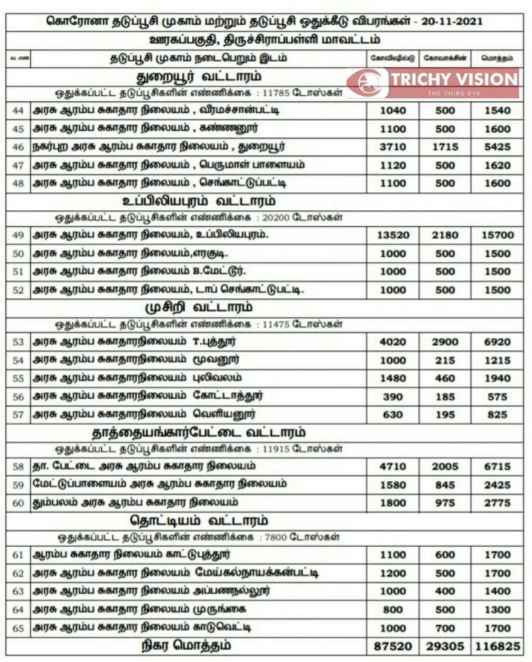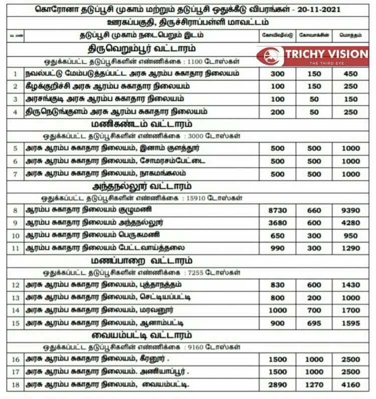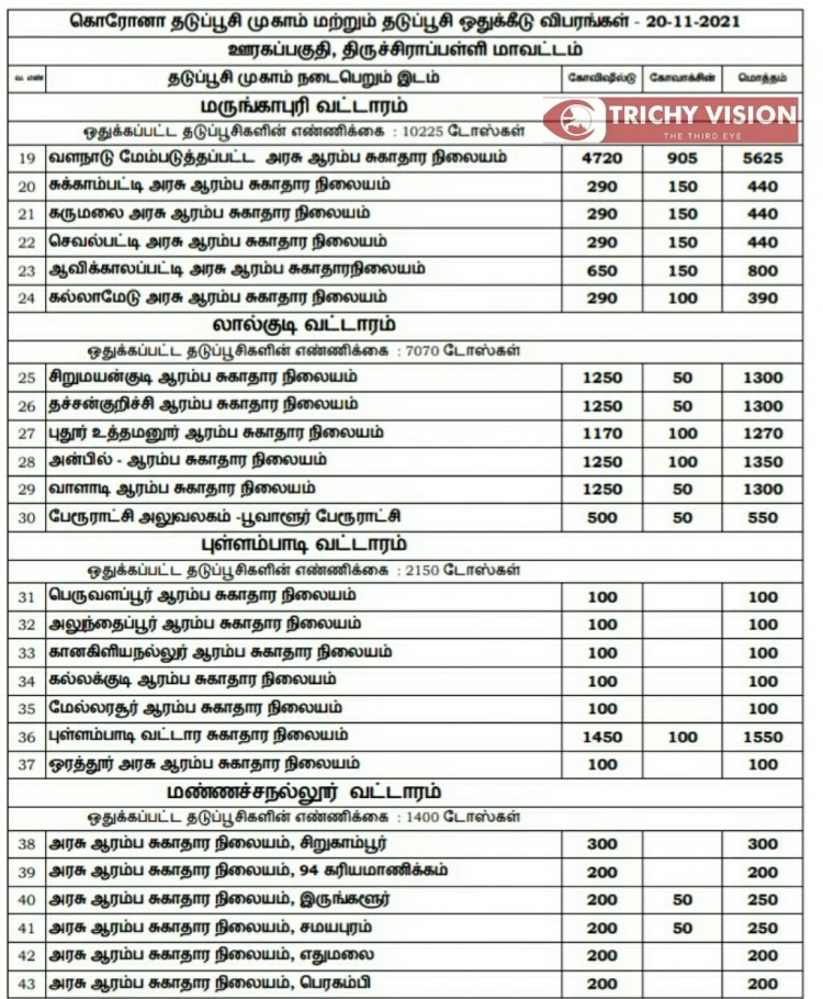 திருச்சி மாவட்டத்தில் நாளை (20.11.2021) கோவிசீல்டு, கோவாக்சின் தடுப்பு ஊசிகள் போடப்படும் இடங்களை மாவட்ட நிர்வாகம் அறிவித்துள்ளது.