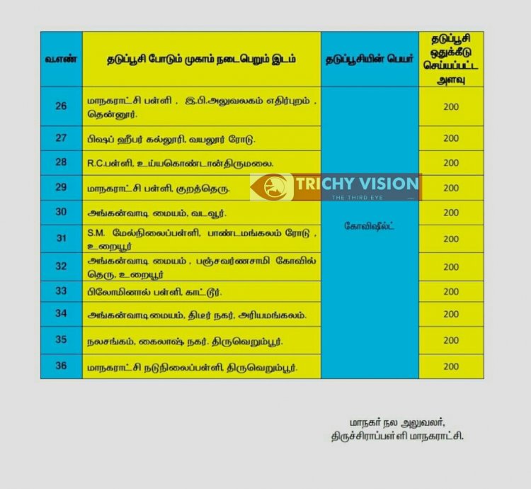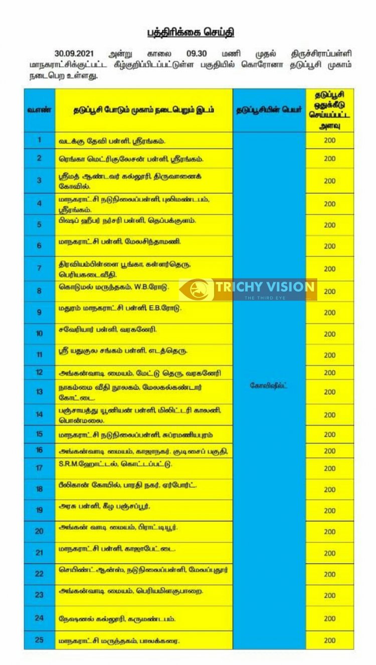 திருச்சி மாநகரில் நாளை (30.09.2021) கோவிசீல்டு தடுப்பு ஊசிகள் போடப்படும் இடங்களை மாநகராட்சி நிர்வாகம் அறிவித்துள்ளது.