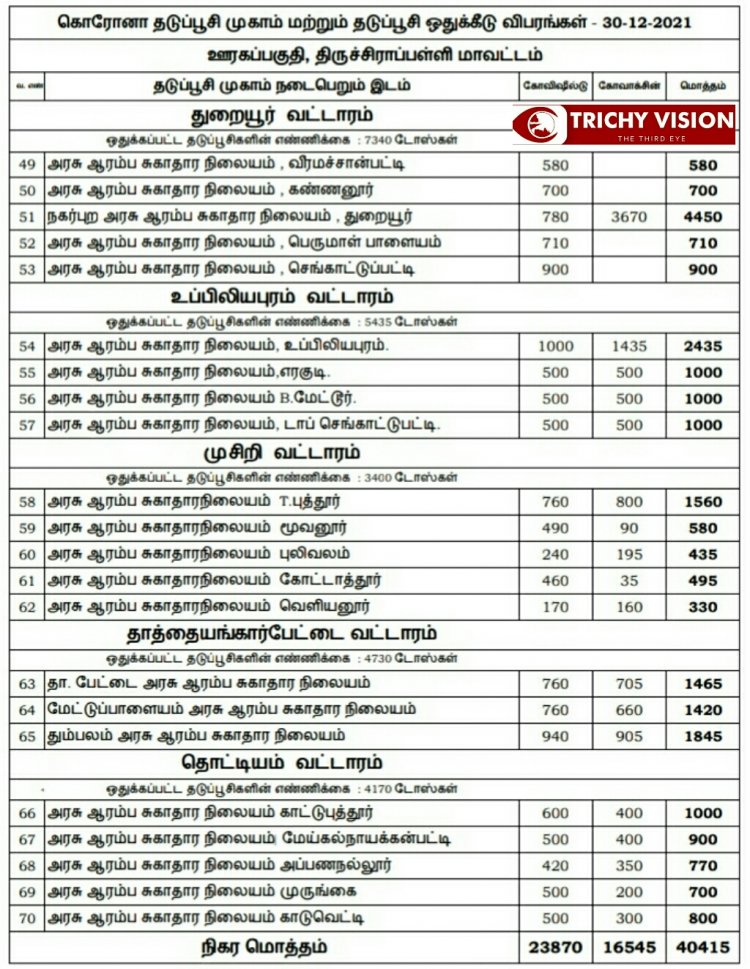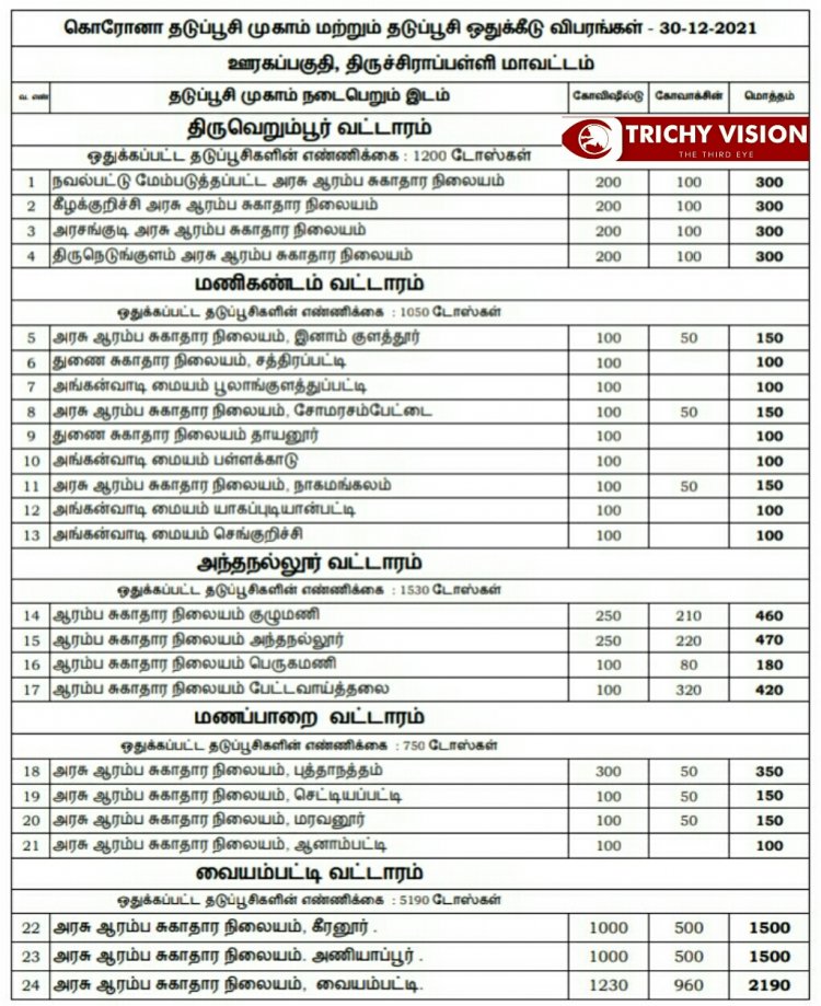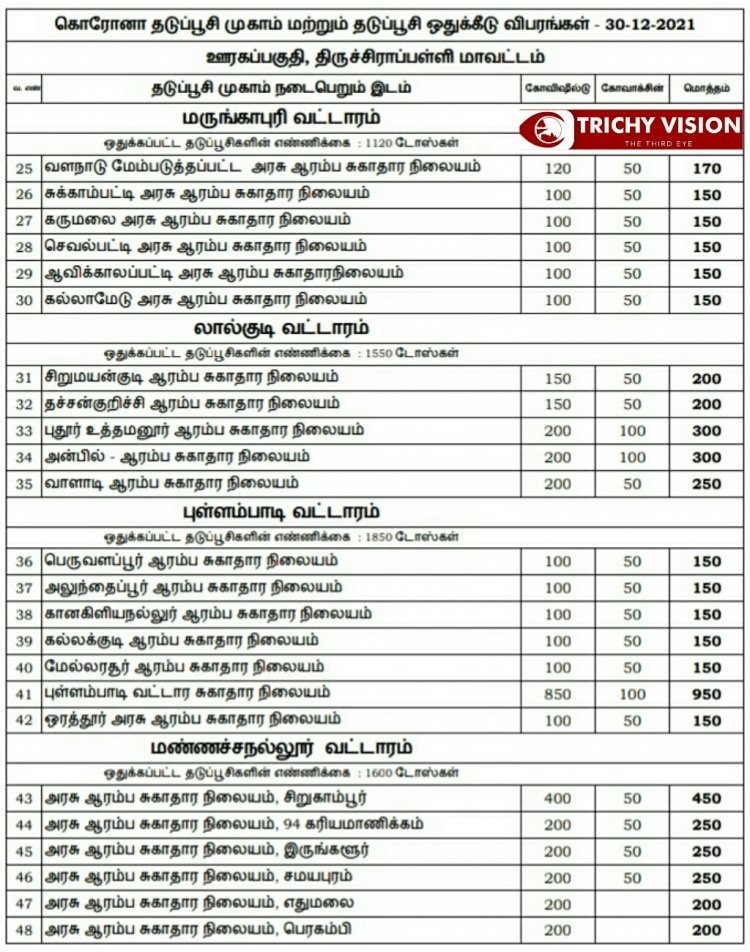 திருச்சி மாவட்டத்தில் நாளை (30.12.2021) கோவிசீல்டு, கோவாக்சின் தடுப்பு ஊசிகள் போடப்படும் இடங்களை மாவட்ட நிர்வாகம் அறிவித்துள்ளது.