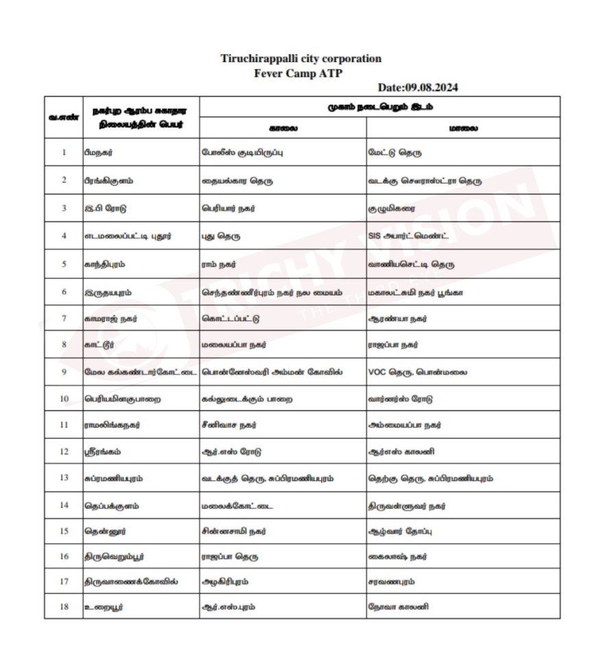 இந்த நிலையில் திருச்சி மாநகராட்சிக்கு உட்பட்ட பகுதிகளில் நாளை (09.08.2024) காய்ச்சல் முகாம் நடைபெறும் இடங்களை மாநகராட்சி அறிவித்துள்ளது.