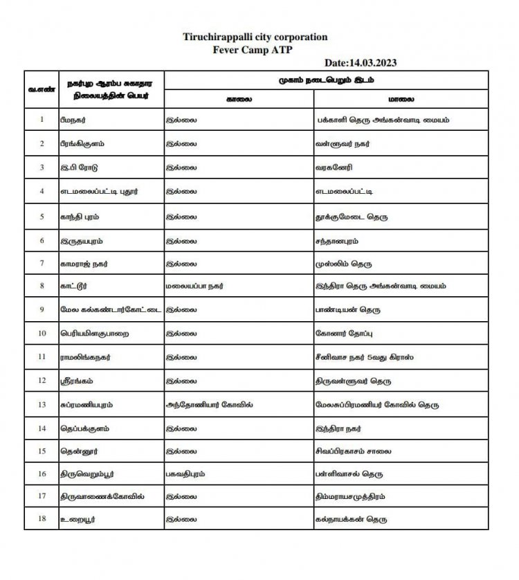 இதனை தொடர்ந்து திருச்சி மாநகராட்சிக்கு உட்பட்ட பகுதிகளில் நாளை (14.03.2023) காய்ச்சல் முகாம் நடைபெறும் இடங்கள் விபரங்களை மாநகராட்சி நிர்வாகம் அறிவித்துள்ளது.