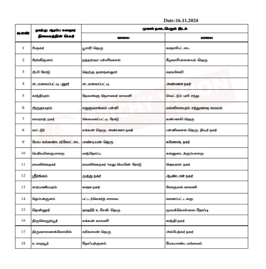 இந்த தொடர்ந்து திருச்சி மாநகராட்சிக்கு உட்பட்ட பகுதிகளில் நாளை (16.11.2024) காய்ச்சல் முகாம் நடைபெறும் இடங்களை மாநகராட்சி அறிவித்துள்ளது.