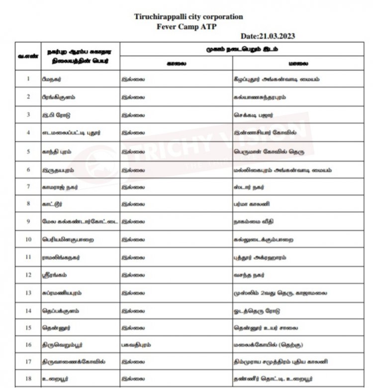 இதனை தொடர்ந்து திருச்சி மாநகராட்சிக்கு உட்பட்ட பகுதிகளில் நாளை (21.03.2023) காய்ச்சல் முகாம் நடைபெறும் இடங்கள் விபரங்களை மாநகராட்சி நிர்வாகம் அறிவித்துள்ளது.