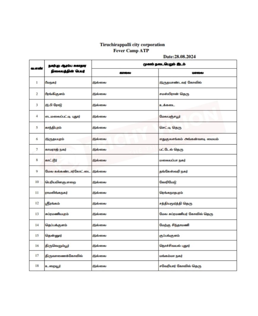 இந்த நிலையில் திருச்சி மாநகராட்சிக்கு உட்பட்ட பகுதிகளில் நாளை (28.08.2024) காய்ச்சல் முகாம் நடைபெறும் இடங்களை மாநகராட்சி அறிவித்துள்ளது.