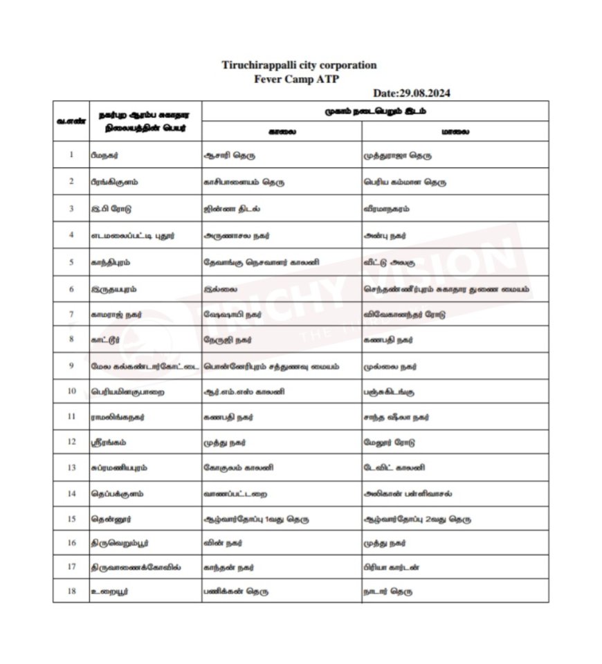 இந்த நிலையில் திருச்சி மாநகராட்சிக்கு உட்பட்ட பகுதிகளில் நாளை (29.08.2024) காய்ச்சல் முகாம் நடைபெறும் இடங்களை மாநகராட்சி அறிவித்துள்ளது.