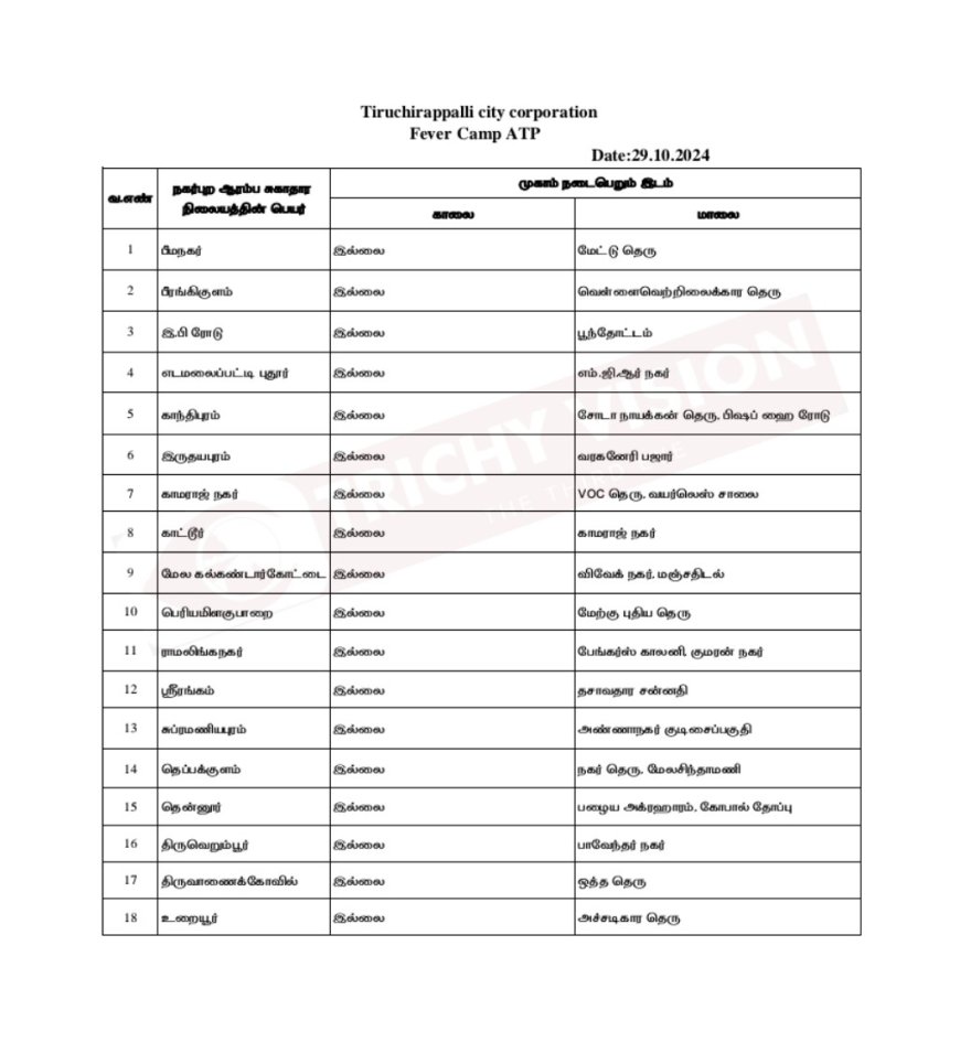 இந்த தொடர்ந்து திருச்சி மாநகராட்சிக்கு உட்பட்ட பகுதிகளில் நாளை (29.10.2024) காய்ச்சல் முகாம் நடைபெறும் இடங்களை மாநகராட்சி அறிவித்துள்ளது.