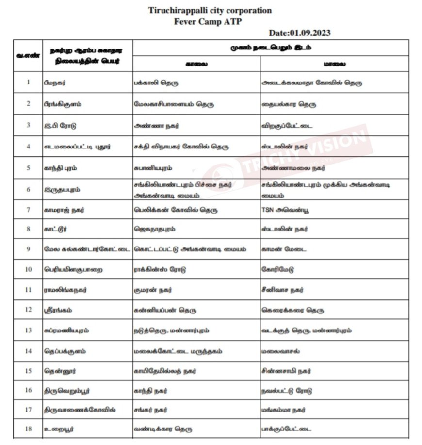இதனை கருத்தில் கொண்டு திருச்சி மாநகராட்சி சார்பில் தினந்தோறும் காய்ச்சல் முகாம்கள் நடைபெற்று வருகிறது. இதன் ஒரு பகுதியாக திருச்சி மாநகரில் நாளை (01.09.2023) காய்ச்சல் முகாம்கள் நடைபெறும் இடங்கள் அறிவிக்கப்பட்டுள்ளது.