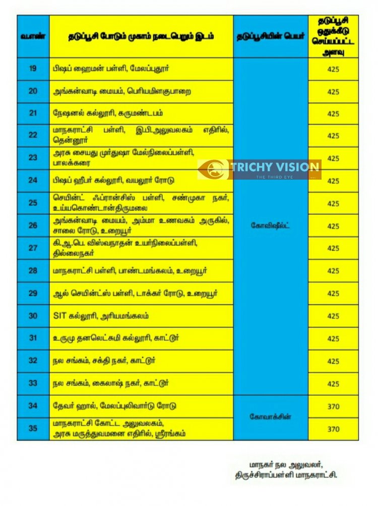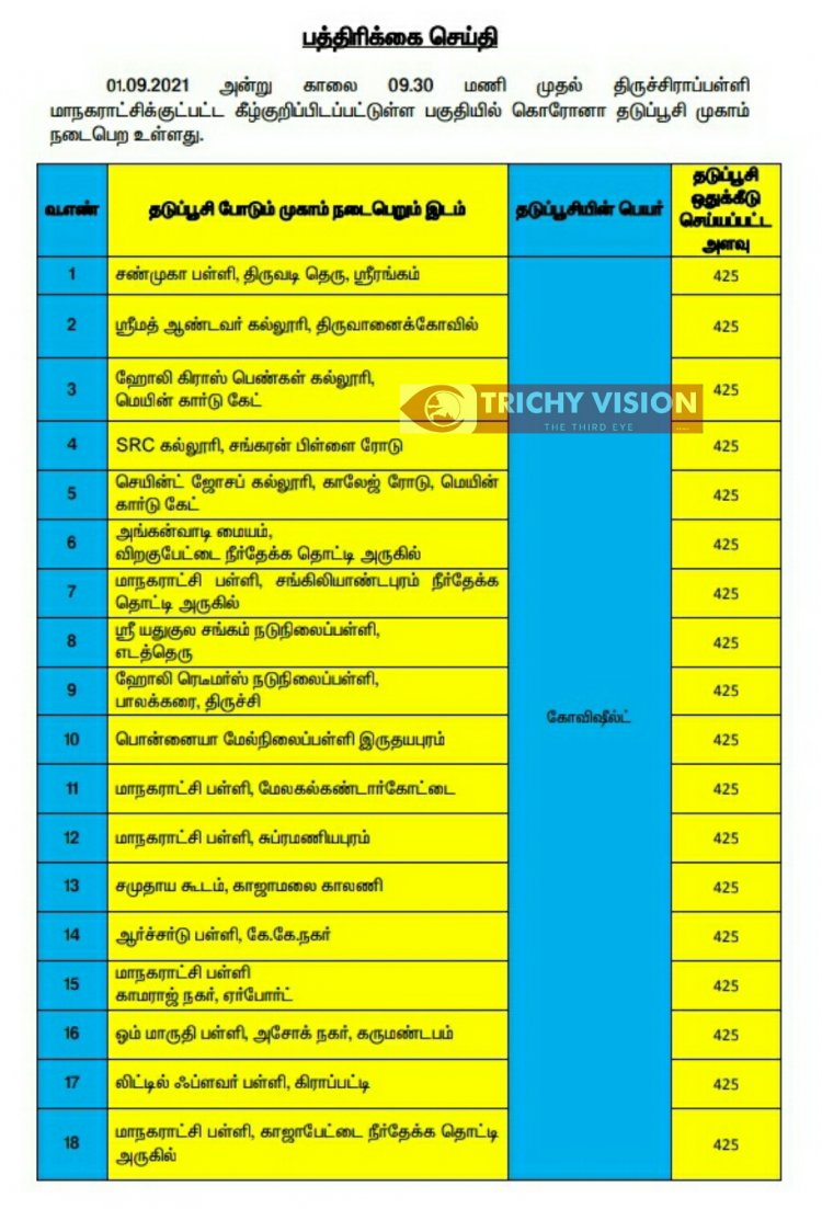 திருச்சி மாநகரில் நாளை (01.09.2021) கோவிசீல்டு, கோவாக்சின் தடுப்பு ஊசிகள் போடப்படும் இடங்களை மாநகராட்சி நிர்வாகம் அறிவித்துள்ளது.