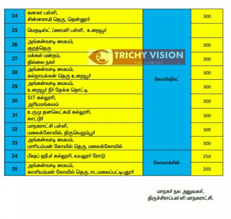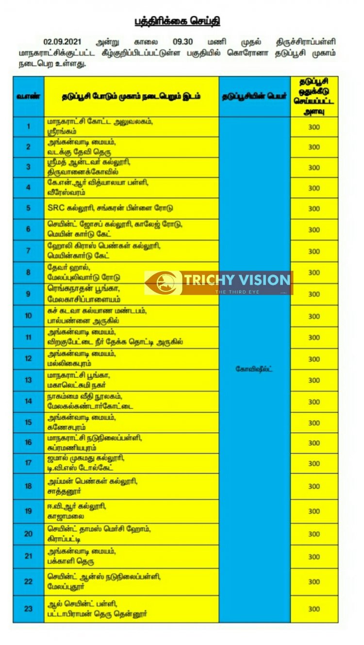 திருச்சி மாநகரில் நாளை (02.09.2021) கோவிசீல்டு, கோவாக்சின் தடுப்பு ஊசிகள் போடப்படும் இடங்களை மாநகராட்சி நிர்வாகம் அறிவித்துள்ளது.