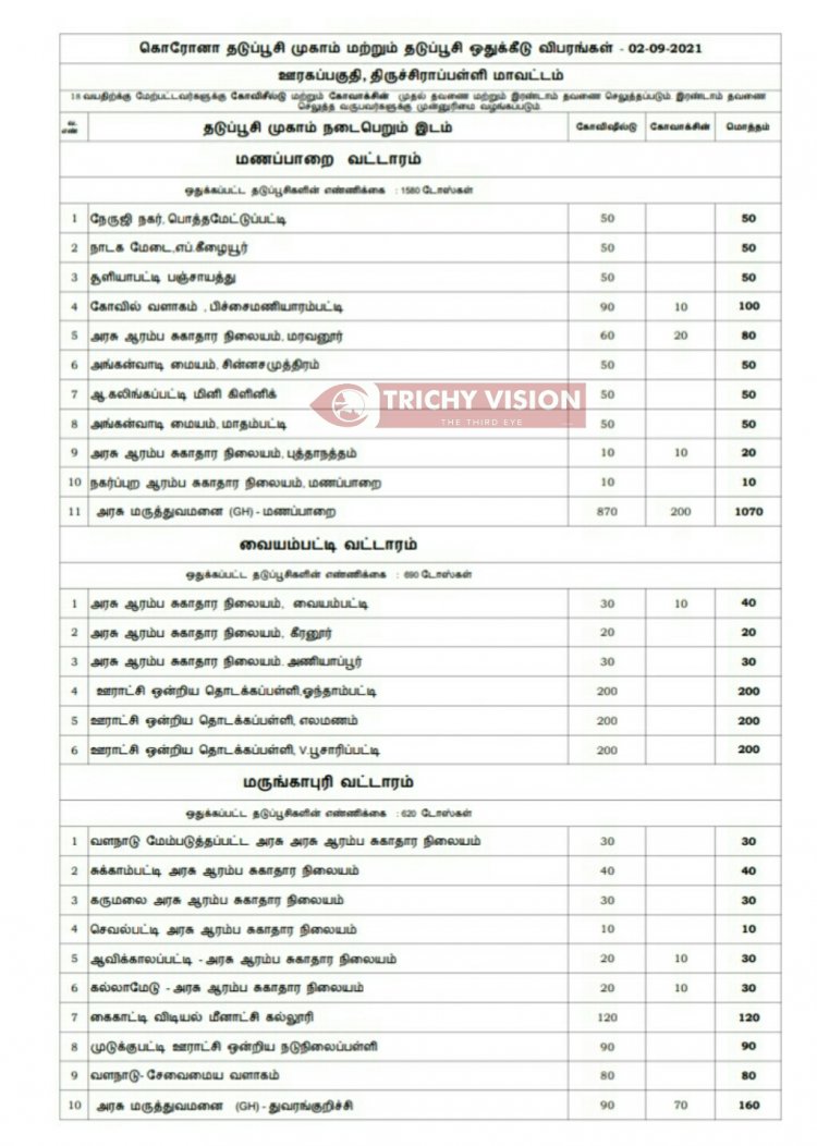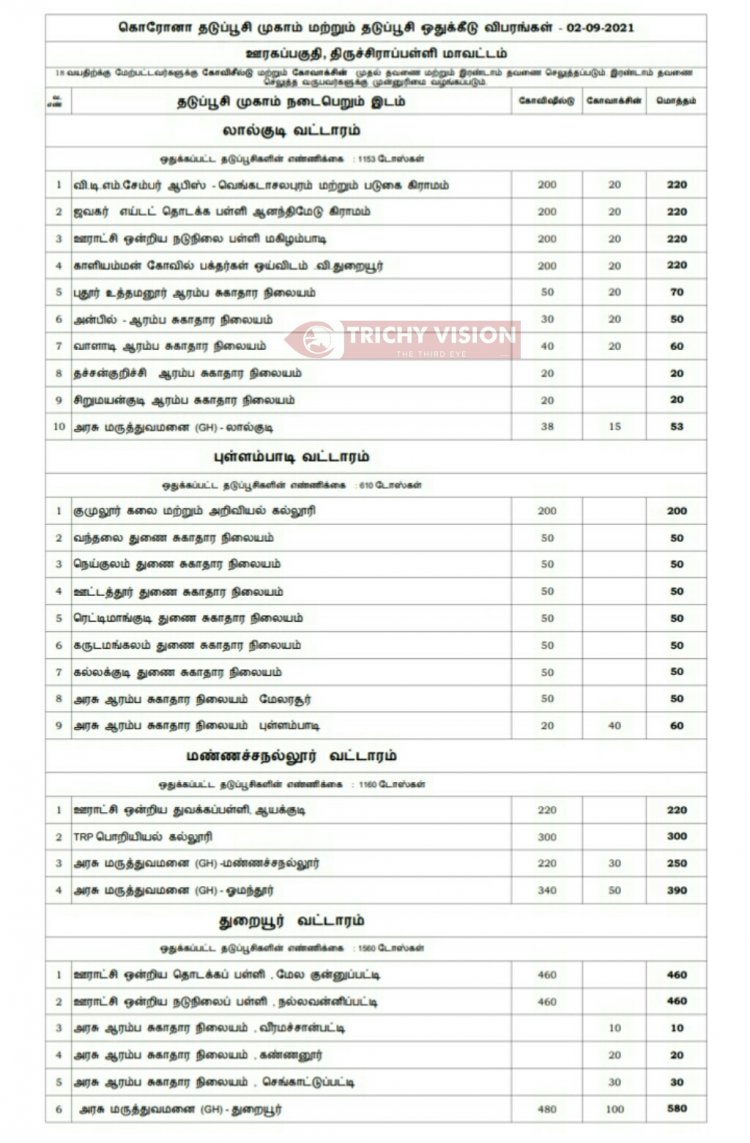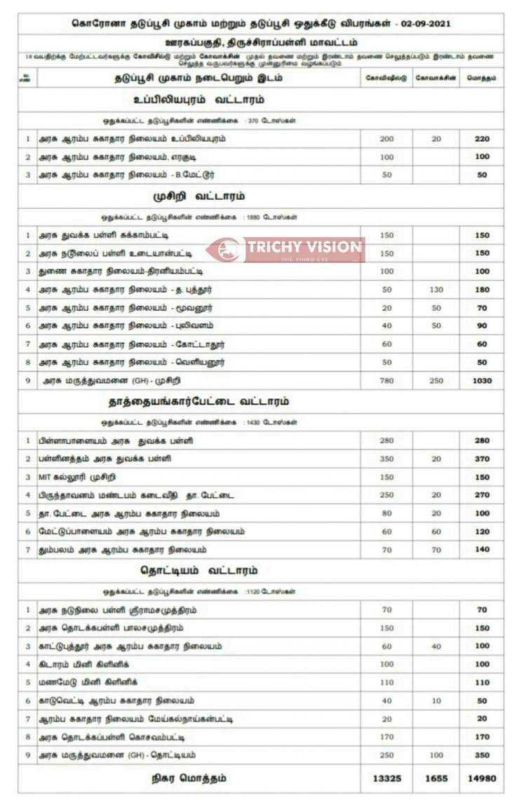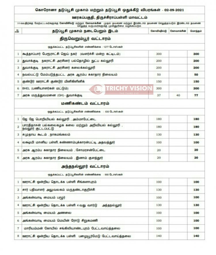 திருச்சி மாவட்டத்தில் நாளை (02.09.2021) கோவிசீல்டு, கோவாக்சின் தடுப்பு ஊசிகள் போடப்படும் இடங்களை மாவட்ட நிர்வாகம் அறிவித்துள்ளது.