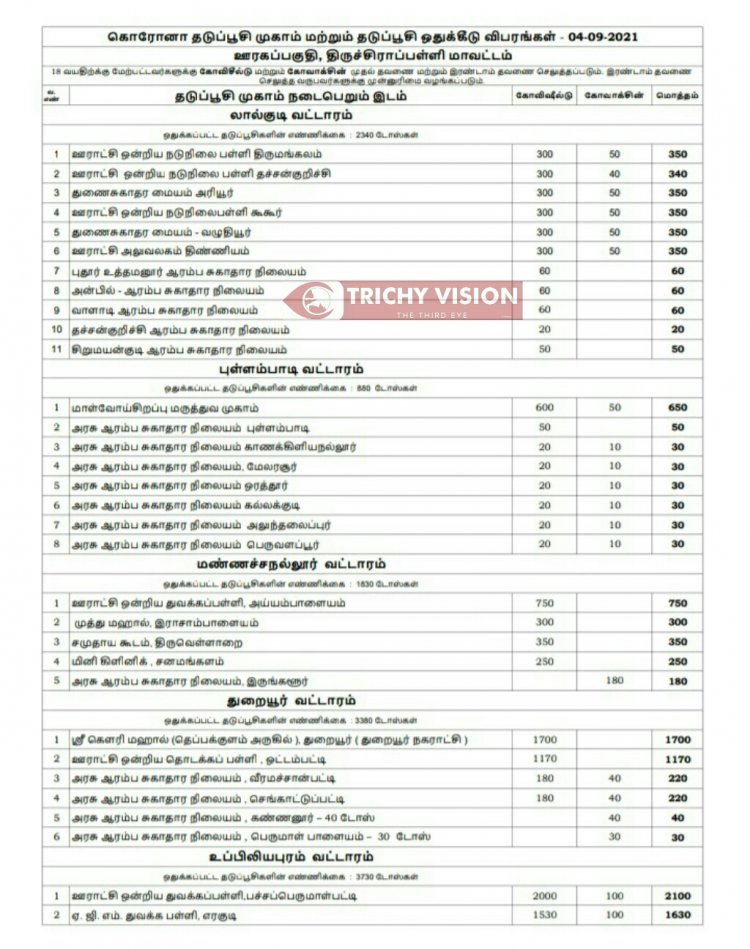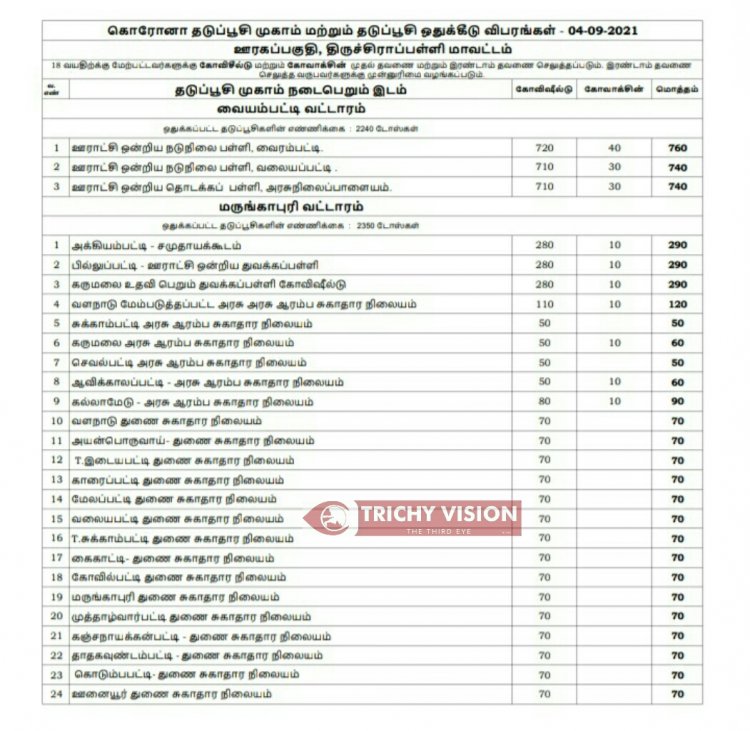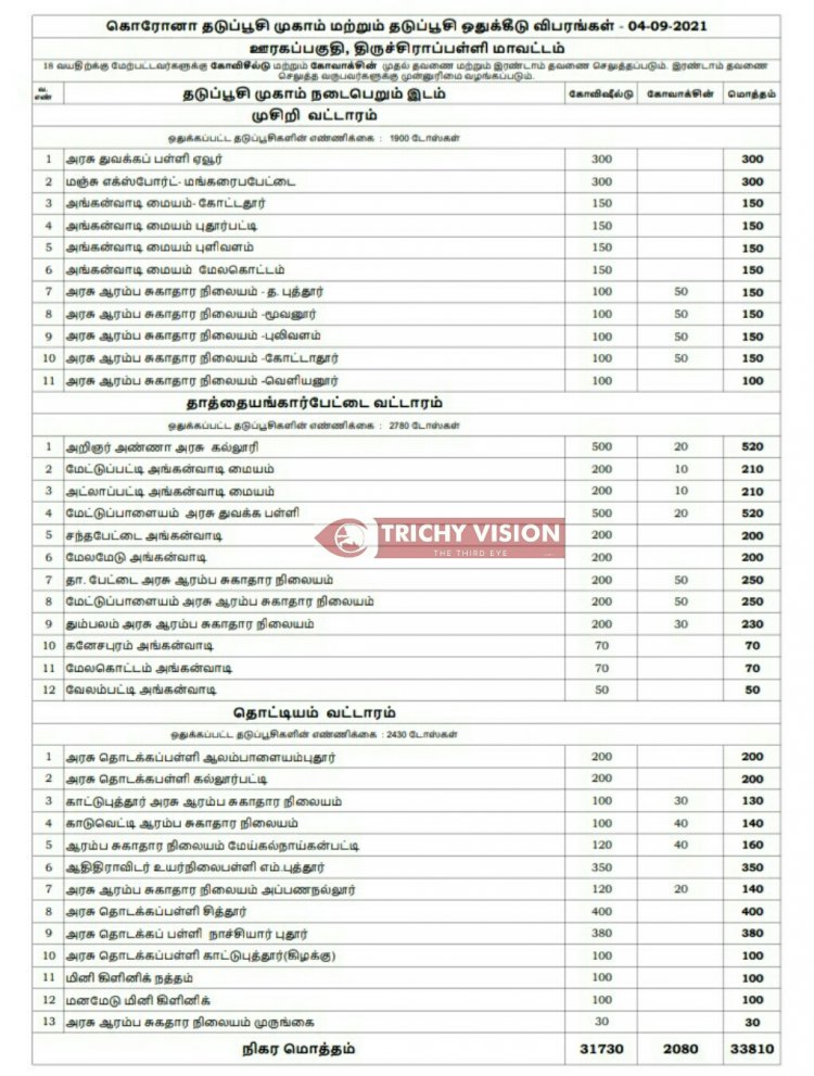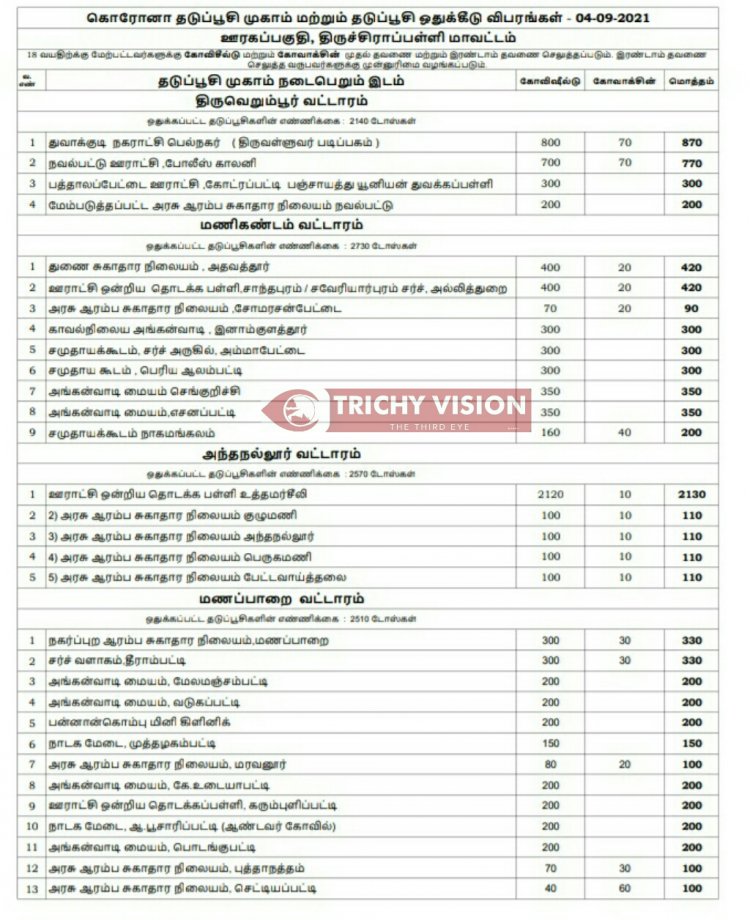 திருச்சி மாவட்டத்தில் நாளை (04.09.2021) கோவிசீல்டு, கோவாக்சின் தடுப்பு ஊசிகள் போடப்படும் இடங்களை மாவட்ட நிர்வாகம் அறிவித்துள்ளது.