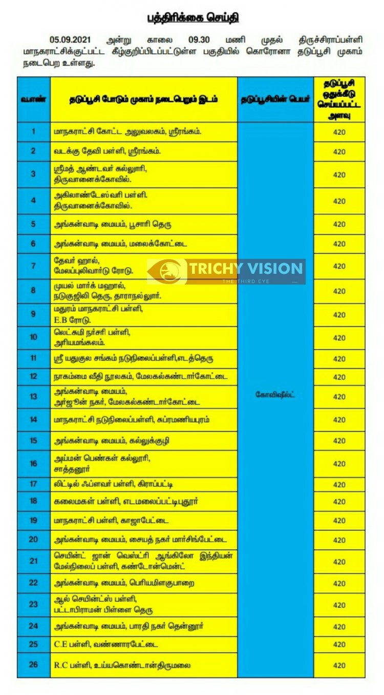 திருச்சி மாநகரில் நாளை (05.09.2021) கோவிசீல்டு, கோவாக்சின் தடுப்பு ஊசிகள் போடப்படும் இடங்களை மாநகராட்சி நிர்வாகம் அறிவித்துள்ளது.