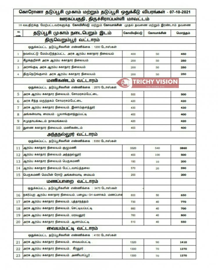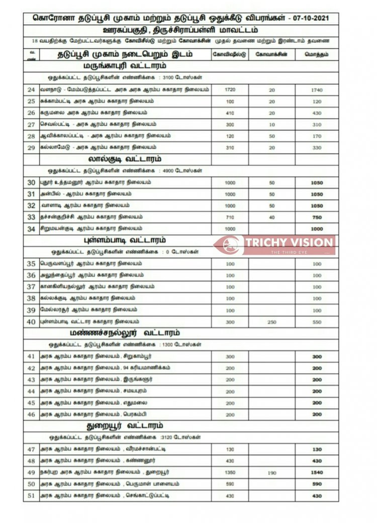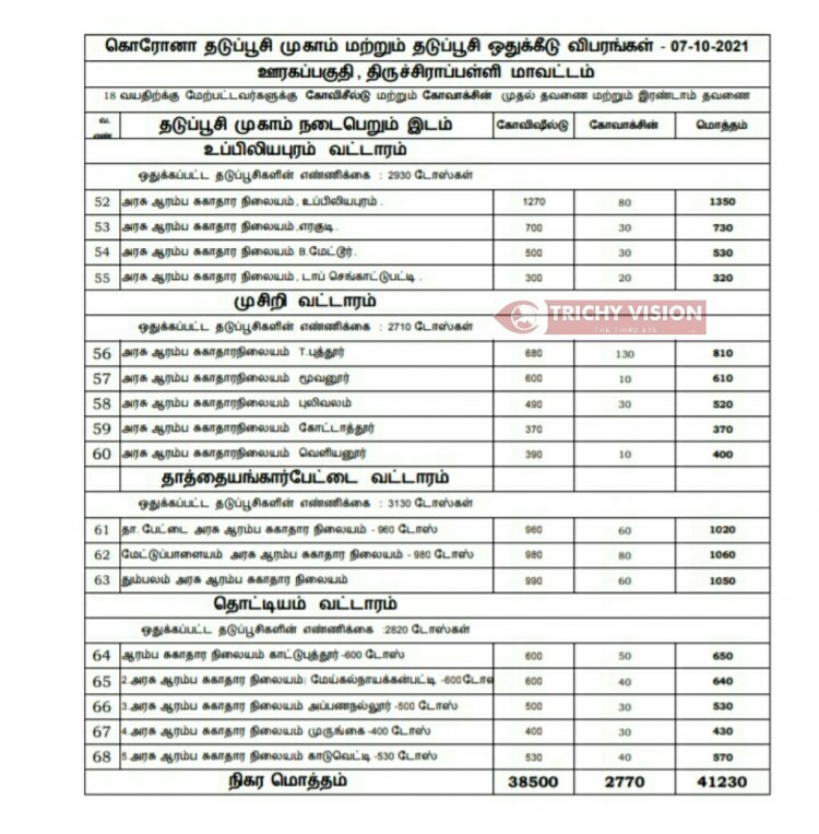 திருச்சி மாவட்டத்தில் நாளை (07.10.2021) கோவிசீல்டு, கோவாக்சின் தடுப்பு ஊசிகள் போடப்படும் இடங்களை மாவட்ட நிர்வாகம் அறிவித்துள்ளது.