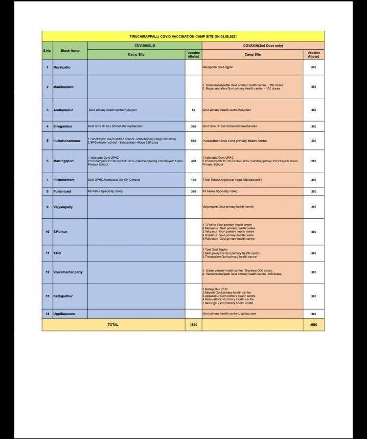 திருச்சி மாவட்டத்தில் நாளை (08.08.2021) கோவிசீல்டு, கோவாக்சின் தடுப்பு ஊசிகள் போடப்படும் இடங்களை மாவட்ட நிர்வாகம் அறிவித்துள்ளது.