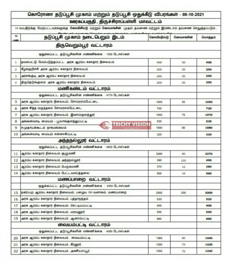 திருச்சி மாவட்டத்தில் நாளை (08.10.2021) கோவிட் தடுப்பு ஊசி போடப்படும் இடங்கள்