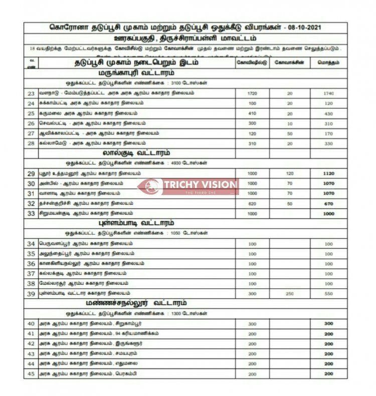திருச்சி மாவட்டத்தில் நாளை (08.10.2021) கோவிசீல்டு, கோவாக்சின் தடுப்பு ஊசிகள் போடப்படும் இடங்களை மாவட்ட நிர்வாகம் அறிவித்துள்ளது.