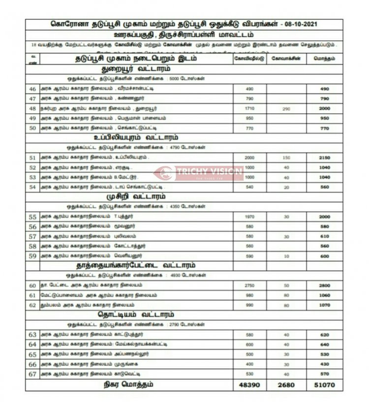திருச்சி மாவட்டத்தில் நாளை (08.10.2021) கோவிசீல்டு 48390, கோவாக்சின் 2680 என மொத்தம் 51070 தடுப்பூசிகள் போடப்படும் என மாவட்ட ஆட்சியர் தெரிவித்துள்ளார்.