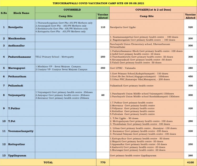திருச்சி மாவட்டத்தில் நாளை (09.08.2021) கோவிசீல்டு 770, கோவாக்சின் 4100 தடுப்பூசிகள் போடப்படும் என ஆட்சியர் தெரிவித்துள்ளார்.