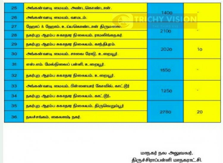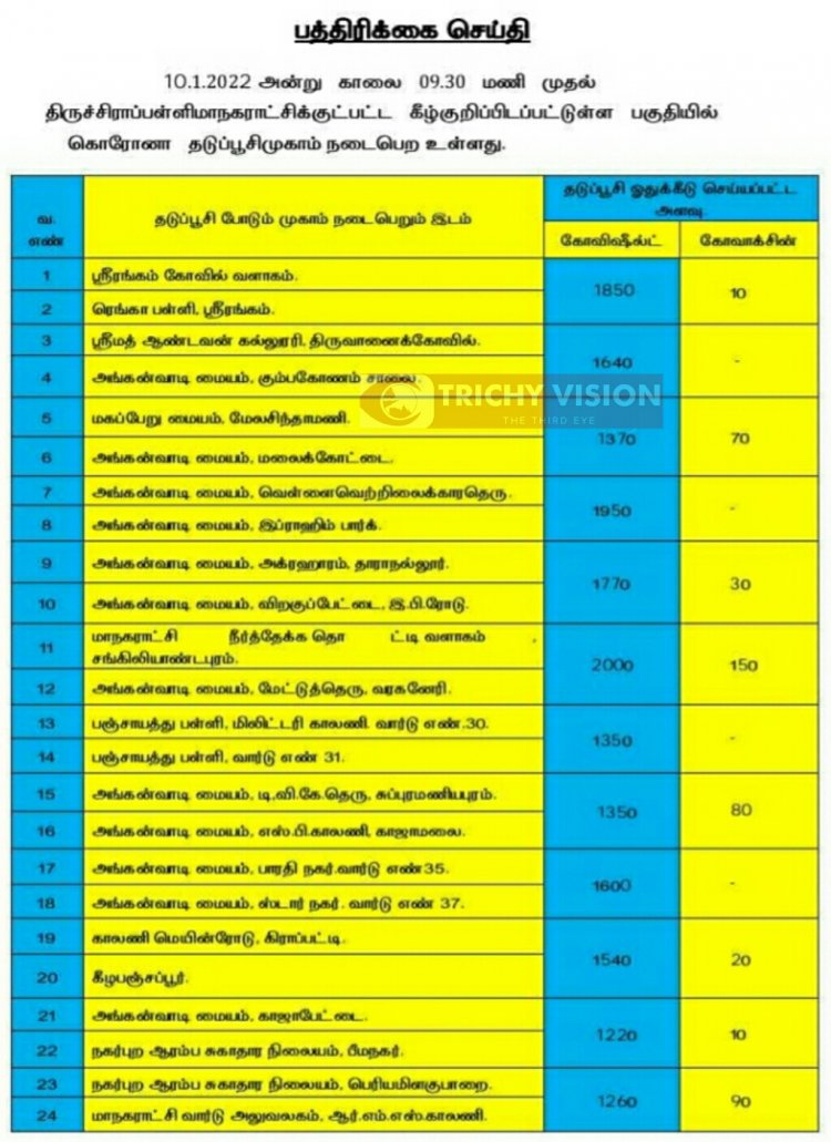 திருச்சி மாநகரில் நாளை (10.01.2022) கோவிசீல்டு, கோவாக்சின் தடுப்பு ஊசிகள் போடப்படும் இடங்களை மாநகராட்சி நிர்வாகம் அறிவித்துள்ளது.