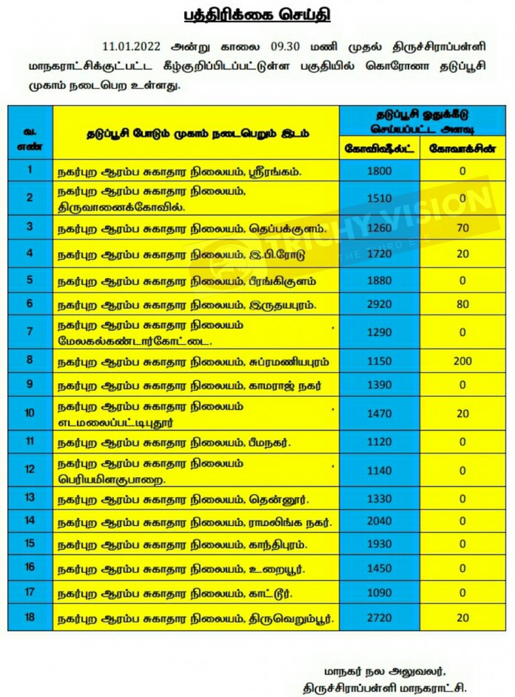 திருச்சி மாநகரில் நாளை (11.01.2022) கோவிசீல்டு, கோவாக்சின் தடுப்பு ஊசிகள் போடப்படும் இடங்களை மாநகராட்சி நிர்வாகம் அறிவித்துள்ளது.