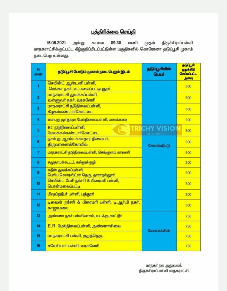 திருச்சி மாநகரில் நாளை (15.08.2021) கோவிசீல்டு, கோவாக்சான் தடுப்பு ஊசிகள் போடப்படும் இடங்களை மாநகராட்சி நிர்வாகம் அறிவித்துள்ளது.