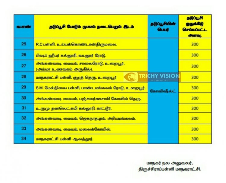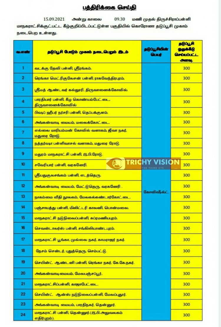 திருச்சி மாநகரில் நாளை (15.09.2021) கோவிசீல்டு தடுப்பு ஊசிகள் போடப்படும் இடங்களை மாநகராட்சி நிர்வாகம் அறிவித்துள்ளது.