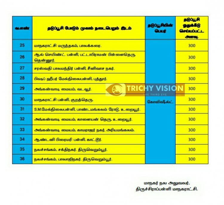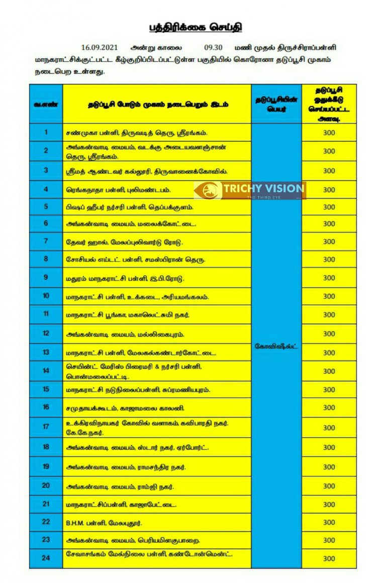 திருச்சி மாநகரில் நாளை (16.09.2021) கோவிசீல்டு, கோவாக்சின் தடுப்பு ஊசிகள் போடப்படும் இடங்களை மாநகராட்சி நிர்வாகம் அறிவித்துள்ளது.