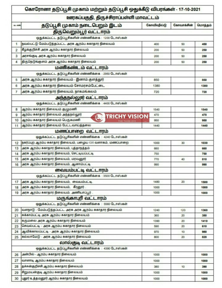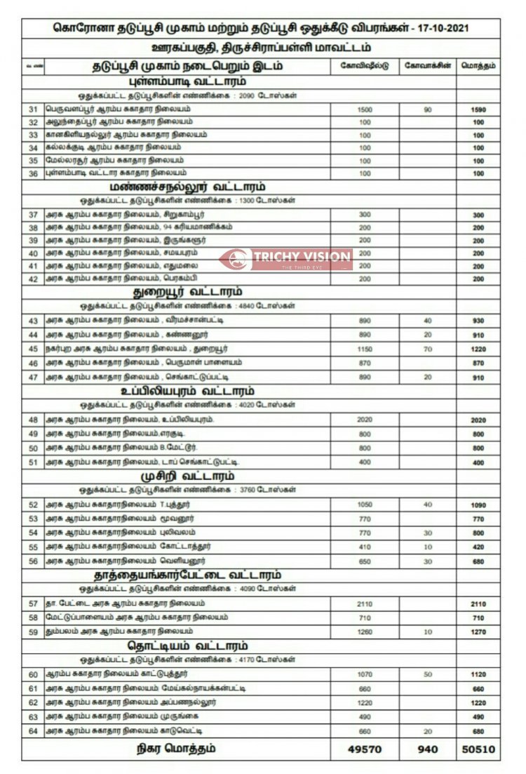 திருச்சி மாவட்டத்தில் நாளை (17.10.2021) கோவிட் தடுப்பு ஊசி போடப்படும் இடங்கள்