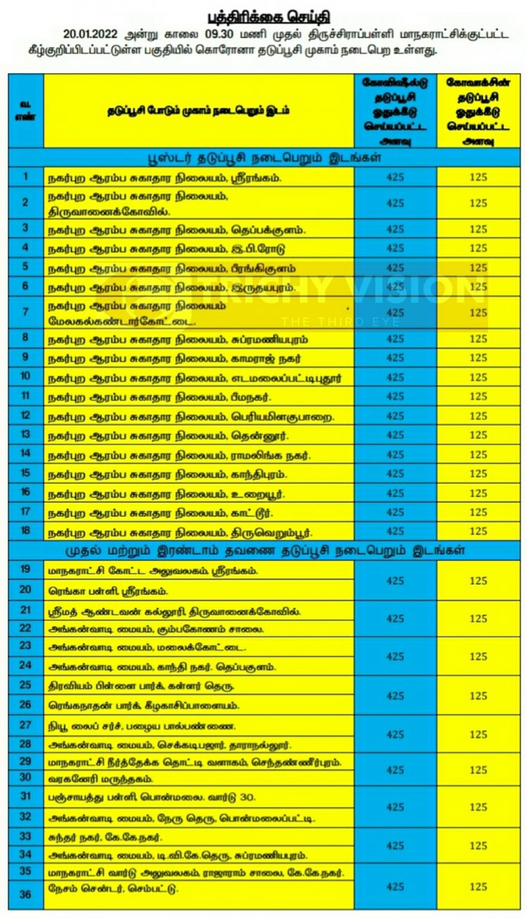 திருச்சி மாநகரில் நாளை (20.01.2022) கோவிசீல்டு, கோவாக்சின் தடுப்பு ஊசிகள் போடப்படும் இடங்களை மாநகராட்சி நிர்வாகம் அறிவித்துள்ளது.