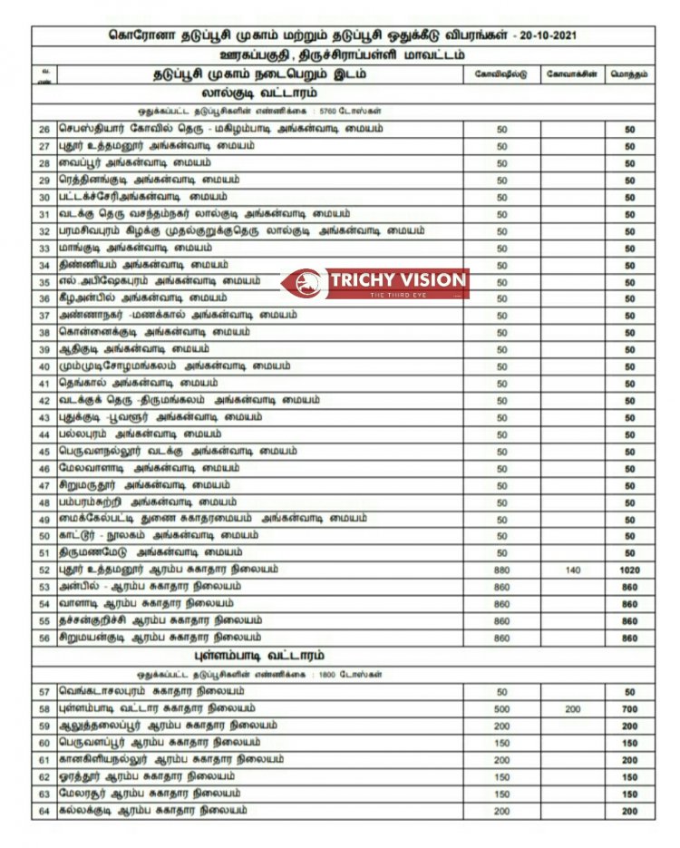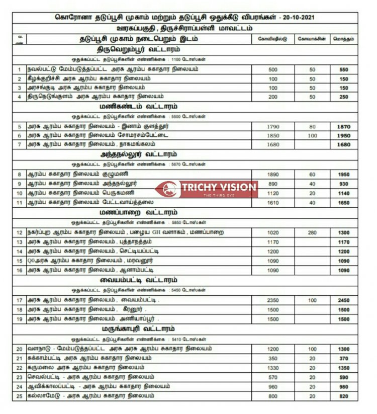 திருச்சி மாவட்டத்தில் நாளை (20.10.2021) கோவிசீல்டு, கோவாக்சின் தடுப்பு ஊசிகள் போடப்படும் இடங்களை மாவட்ட நிர்வாகம் அறிவித்துள்ளது.