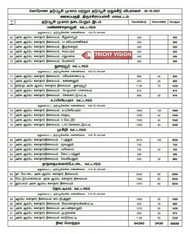 திருச்சி மாவட்டத்தில் நாளை (20.10.2021) கோவிசீல்டு 64260, கோவாக்சின் 2420 என மொத்தம் 66680 தடுப்பூசிகள் போடப்படும் என மாவட்ட ஆட்சியர் தெரிவித்துள்ளார்.