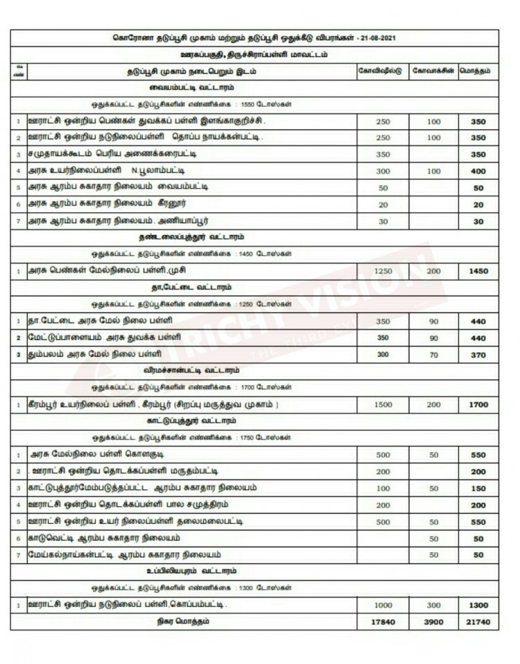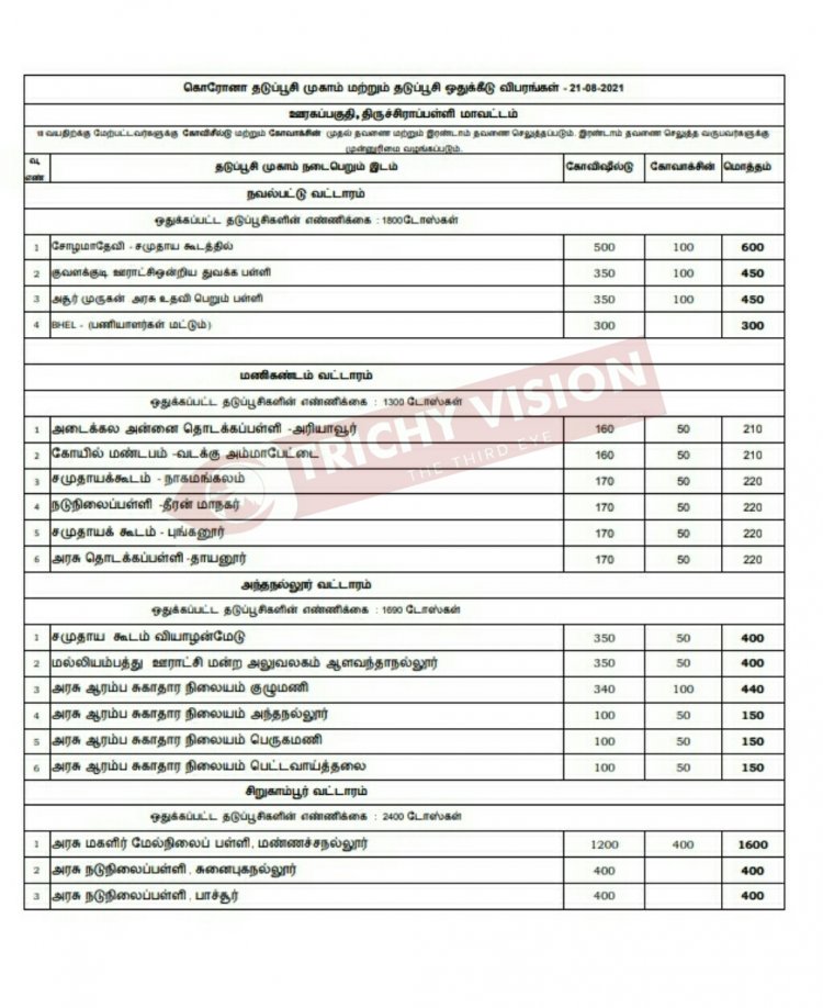 திருச்சி மாவட்டத்தில் நாளை (21.08.2021) 14 ஒன்றியங்களில் கோவிசீல்டு, கோவாக்சின் தடுப்பு ஊசிகள் போடப்படும் இடங்களை மாவட்ட நிர்வாகம் அறிவித்துள்ளது.