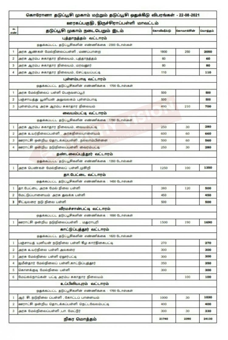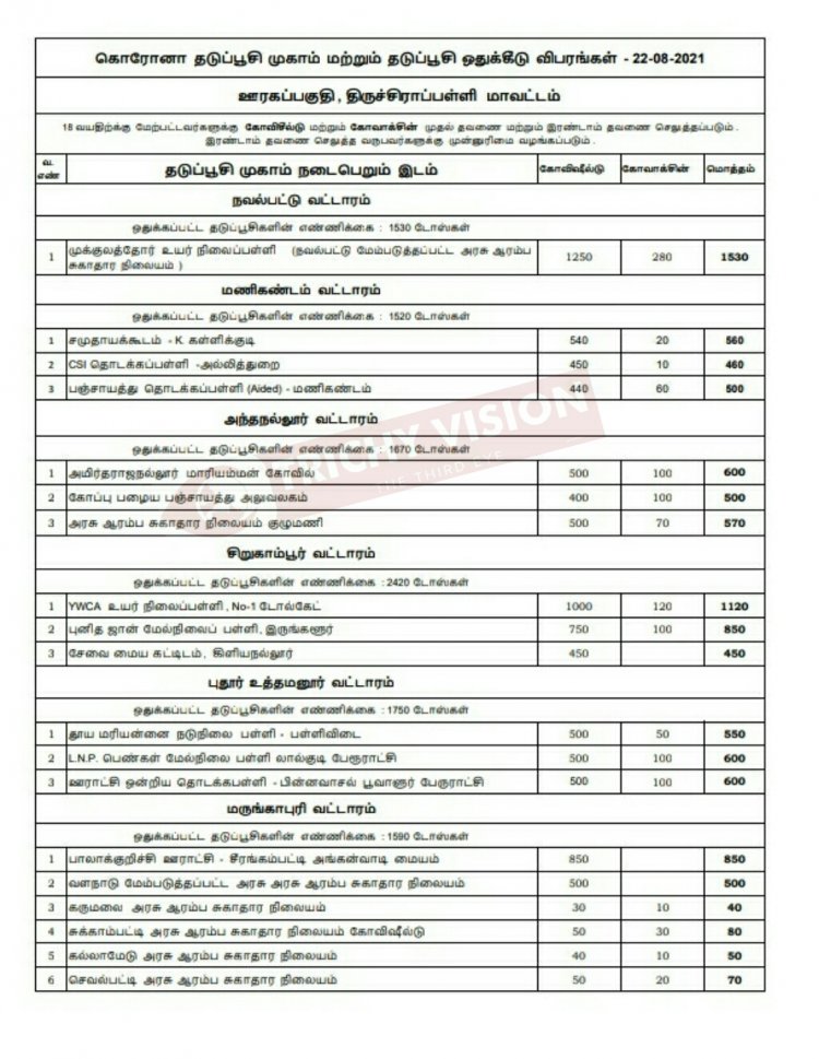 திருச்சி மாவட்டத்தில் நாளை (22.08.2021) 14 ஒன்றியங்களில் கோவிசீல்டு, கோவாக்சின் தடுப்பு ஊசிகள் போடப்படும் இடங்களை மாவட்ட நிர்வாகம் அறிவித்துள்ளது.