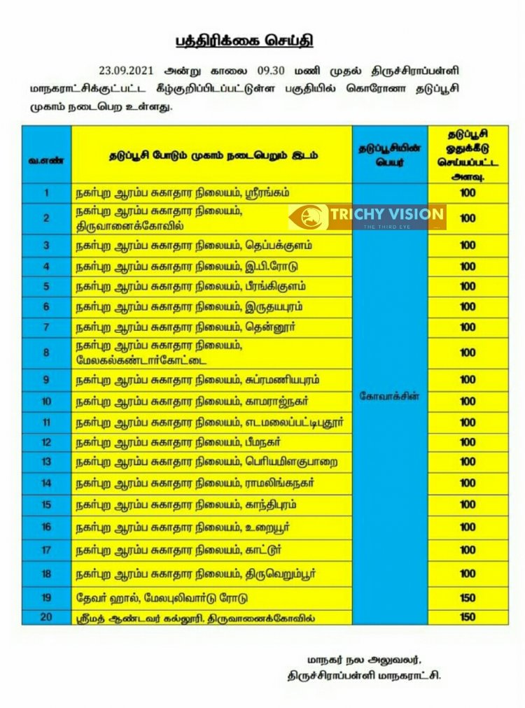 திருச்சி மாநகரில் நாளை (23.09.2021) கோவாக்சின் தடுப்பு ஊசிகள் போடப்படும் இடங்களை மாநகராட்சி நிர்வாகம் அறிவித்துள்ளது.