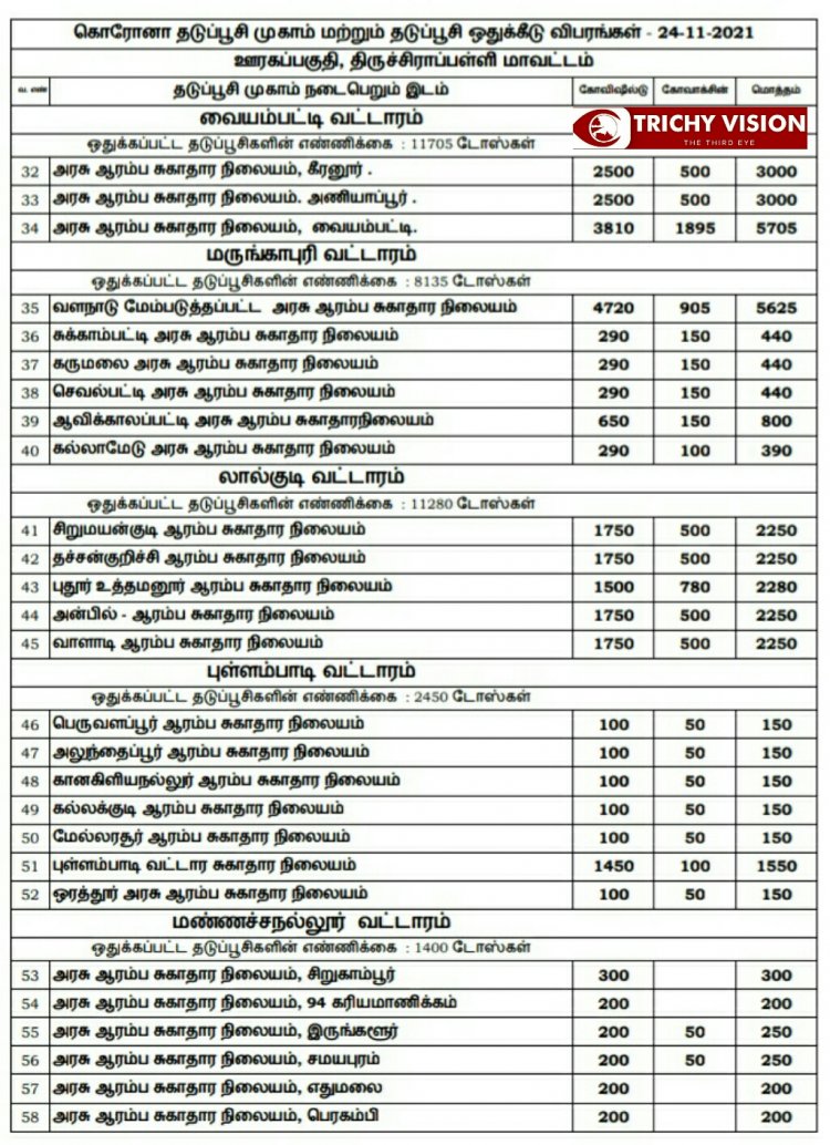 திருச்சி மாவட்டத்தில் நாளை (24.11.2021) கோவிசீல்டு, கோவாக்சின் தடுப்பு ஊசிகள் போடப்படும் இடங்களை மாவட்ட நிர்வாகம் அறிவித்துள்ளது.