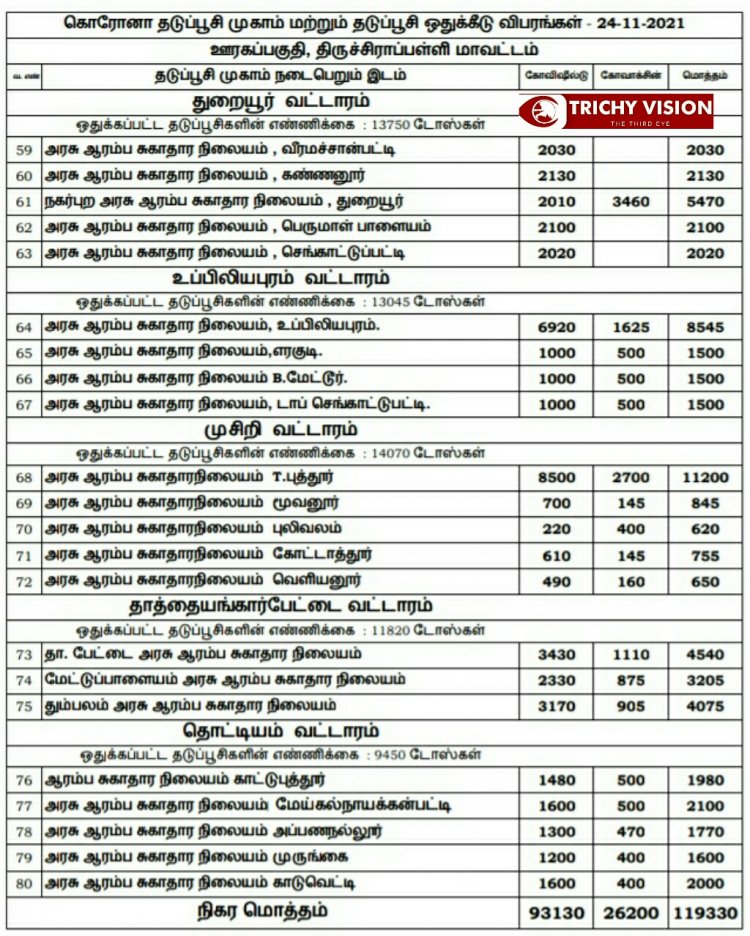 திருச்சி மாவட்டத்தில் நாளை (24.11.2021) கோவிசீல்டு 93130, கோவாக்சின் 26200 என மொத்தம் 119330 தடுப்பூசிகள் போடப்படும் என மாவட்ட ஆட்சியர் தெரிவித்துள்ளார்.